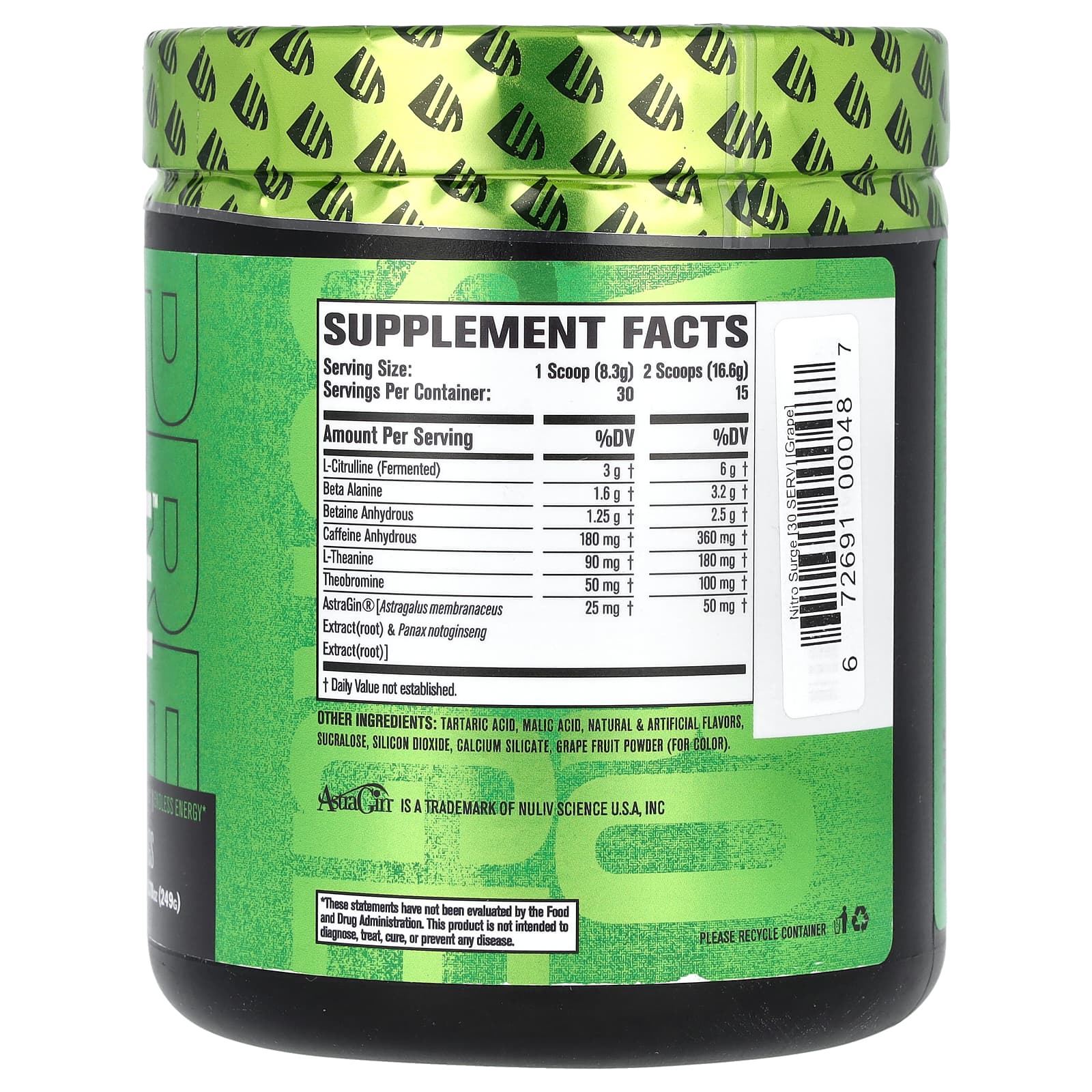 NITRO SURGE ™ - это высокооктановое предтренировочное средство, подтвержденное научными исследованиями и подтвержденное на практике элитными спортсменами и профессиональными бодибилдерами. Вместо того, чтобы пытаться изобретать велосипед, мы овладели основами упражнений, сосредоточив внимание на таких ключевых компонентах, как энергия, острота ума, концентрация мышц, сила и выносливость. Больше никаких потраченных впустую тренировок. Больше никаких сбоев после тренировки. Больше никаких тревог. С NITRO SURGE ™ каждый раз, когда вы посещаете тренажерный зал, вы получаете возможность установить более высокую планку, и, что еще важнее, ваши вкусовые рецепторы получат удовольствие. Попробуйте взять всего одну мерную ложку, мы смеем вас.