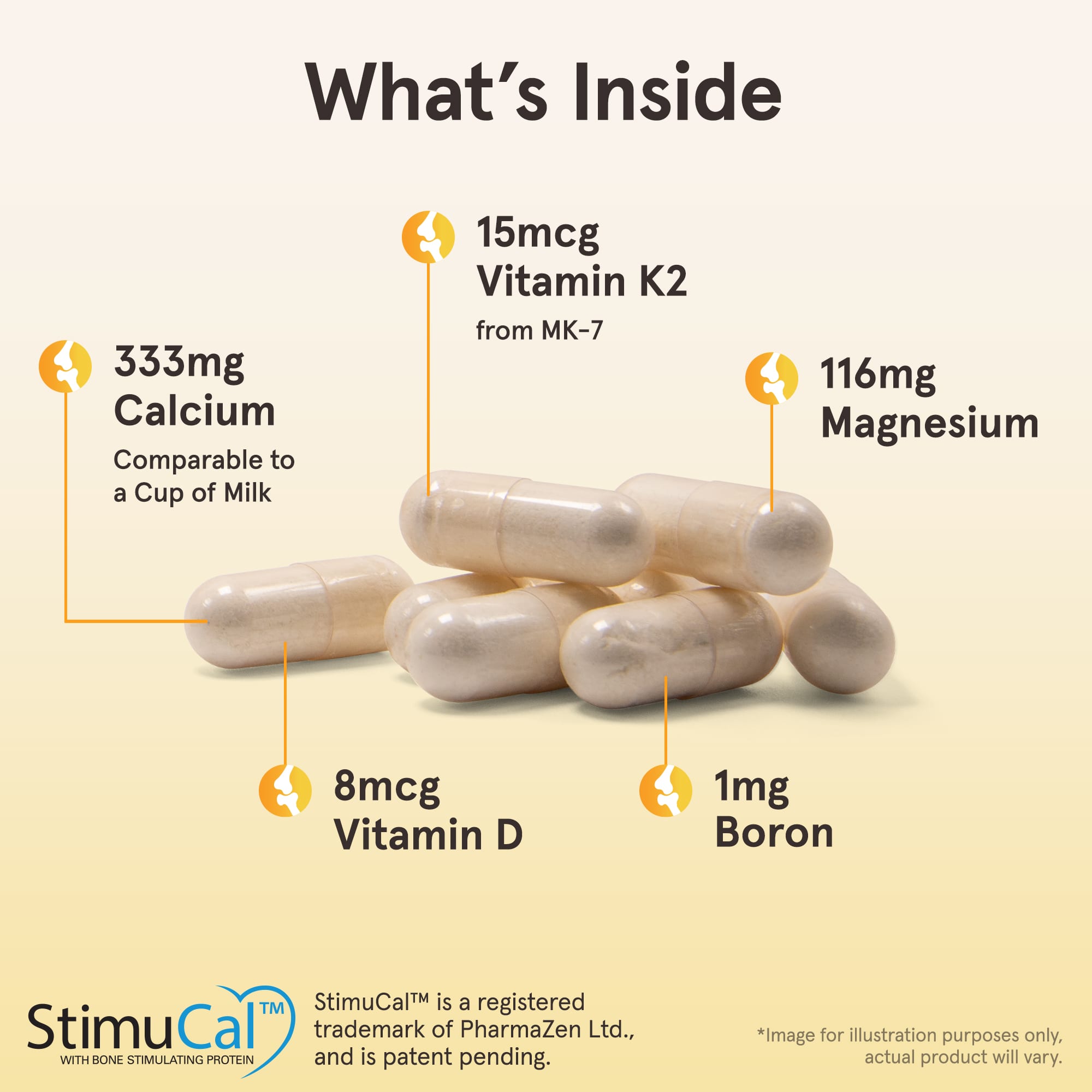 BoneUp® для приема 3 раза в день предлагает многие из тех же питательных веществ, что содержатся в обычном BoneUp®, но в удобной формуле из 3 капсул. StimuCal™ — это комплексная добавка, которая содержит микрокристаллический гидроксиапатит (MCHA) из новозеландских телят, выращенных на свободном выгуле, и микронутриенты для поддержания здоровья костей. StimuCal™ — это натуральный источник кальция, который поддерживает минеральную плотность костей лучше, чем карбонат кальция. StimuCal™ также содержит костные белки, включая коллаген типа I. Витамины D₃ и K₂ действуют вместе для усиления накопления кальция в костях.
