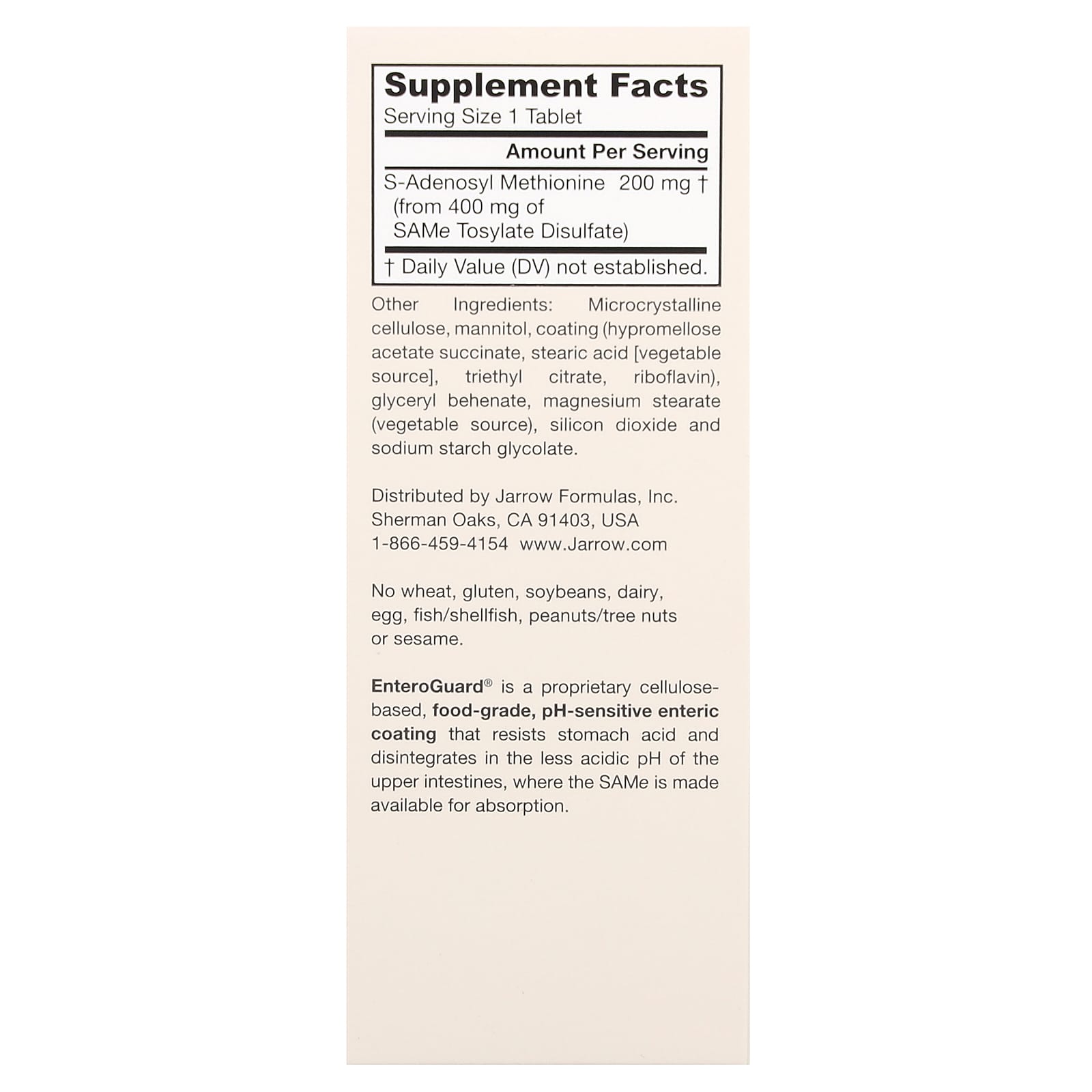 SAM-e 200 от Jarrow Formulas обеспечивает 200 мг SAM-e (чистый выход) из 400 мг тозилатдисульфата SAM-e. SAM-e 200 производится при низкой температуре и низкой влажности и имеет кишечнорастворимое покрытие для обеспечения биологически активного продукта.