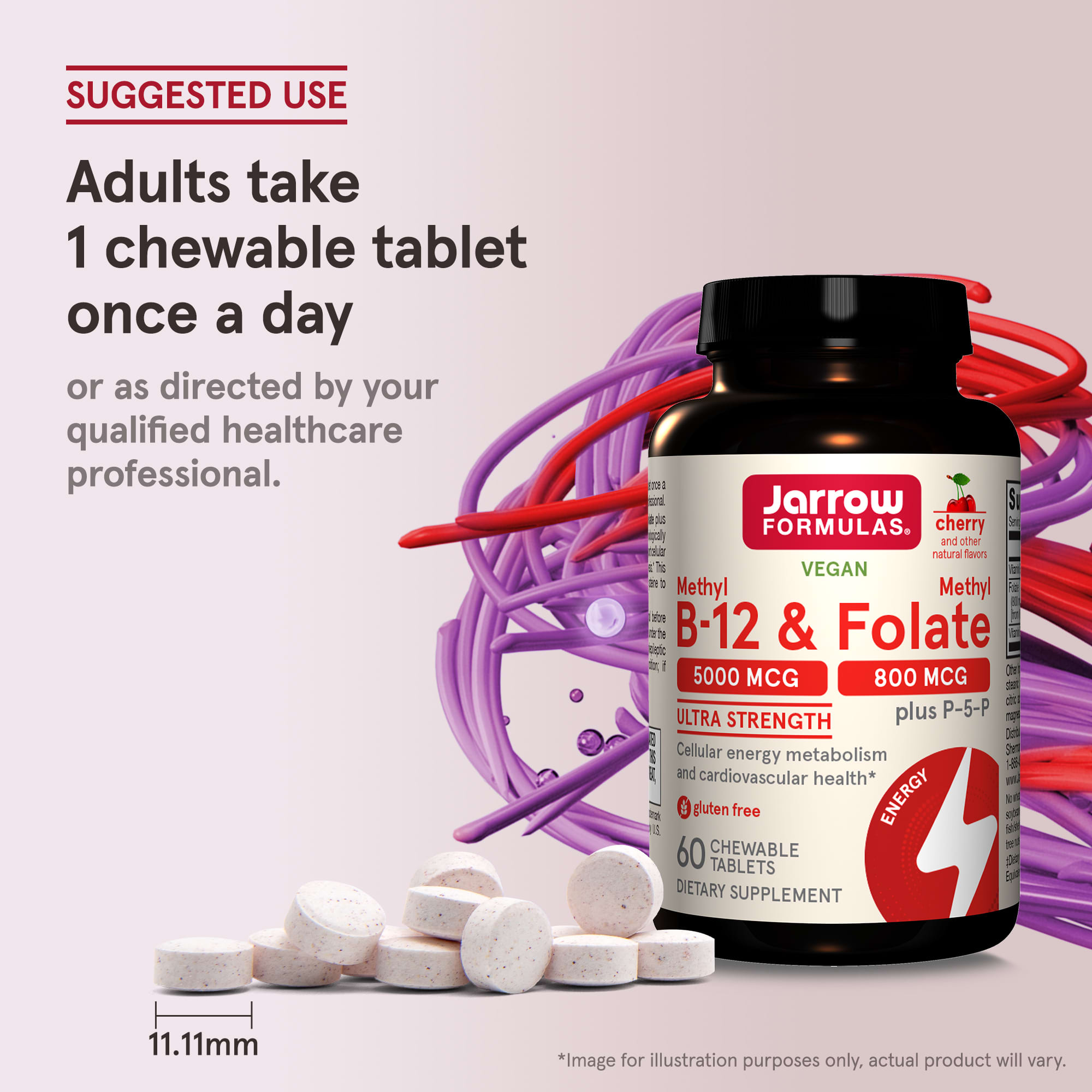 Таблетки «Метил B12 и метилфолат» с пиридоксаль-5-фосфатом (P5P) от Jarrow Formulas® объединяют активные формы этих витаминов для поддержки синтеза ДНК и нейромедиаторов, а также метаболизма аминокислот. Гомоцистеин превращается в метионин с помощью метилфолата и B12, а в цистеин с помощью P5P-зависимых ферментов.