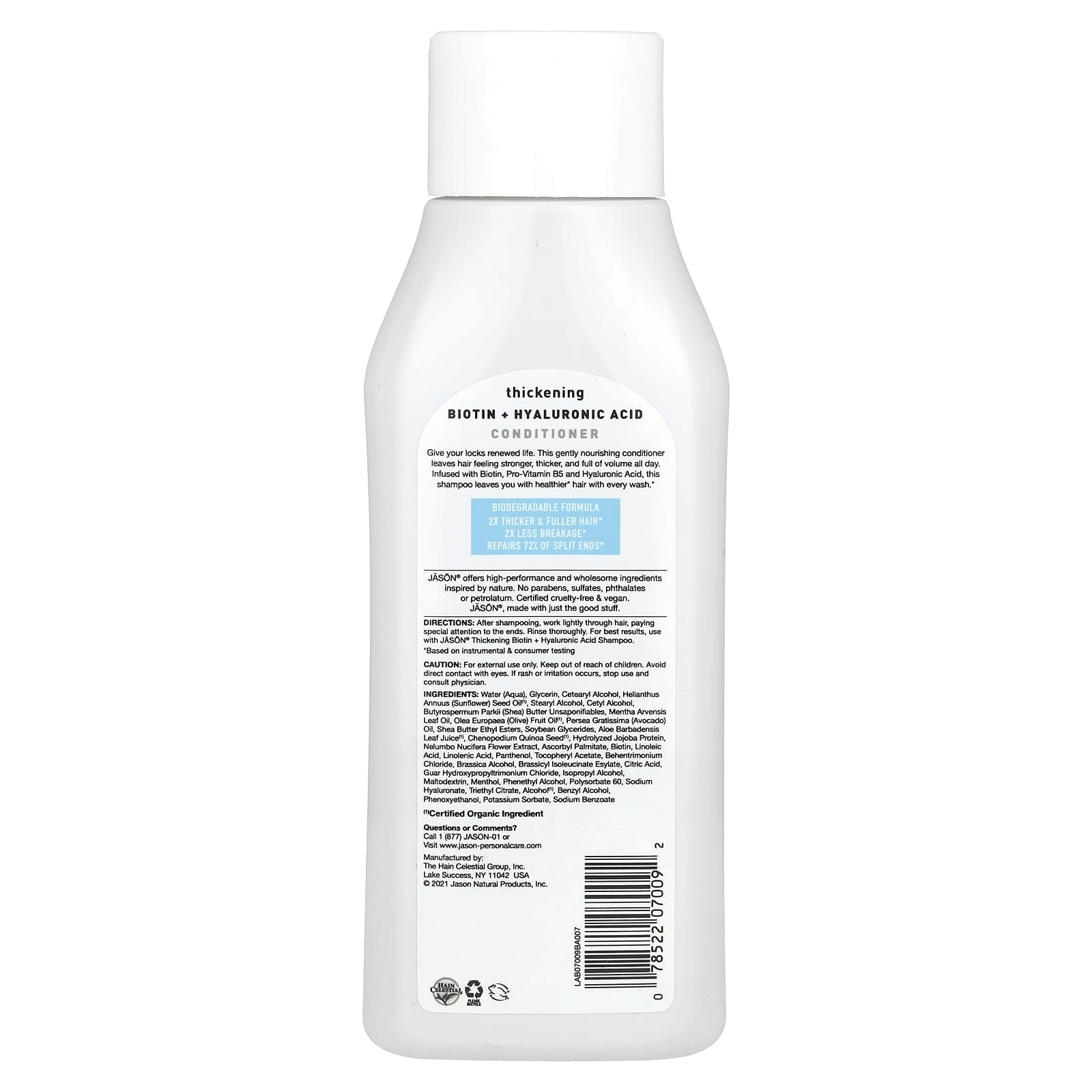 После мытья головы легкими движениями распределите по волосам, уделяя особое внимание кончикам. Тщательно смойте водой. Для достижения наилучших результатов используйте вместе с шампунем для густоты волос с биотином и гиалуроновой кислотой Jason®.