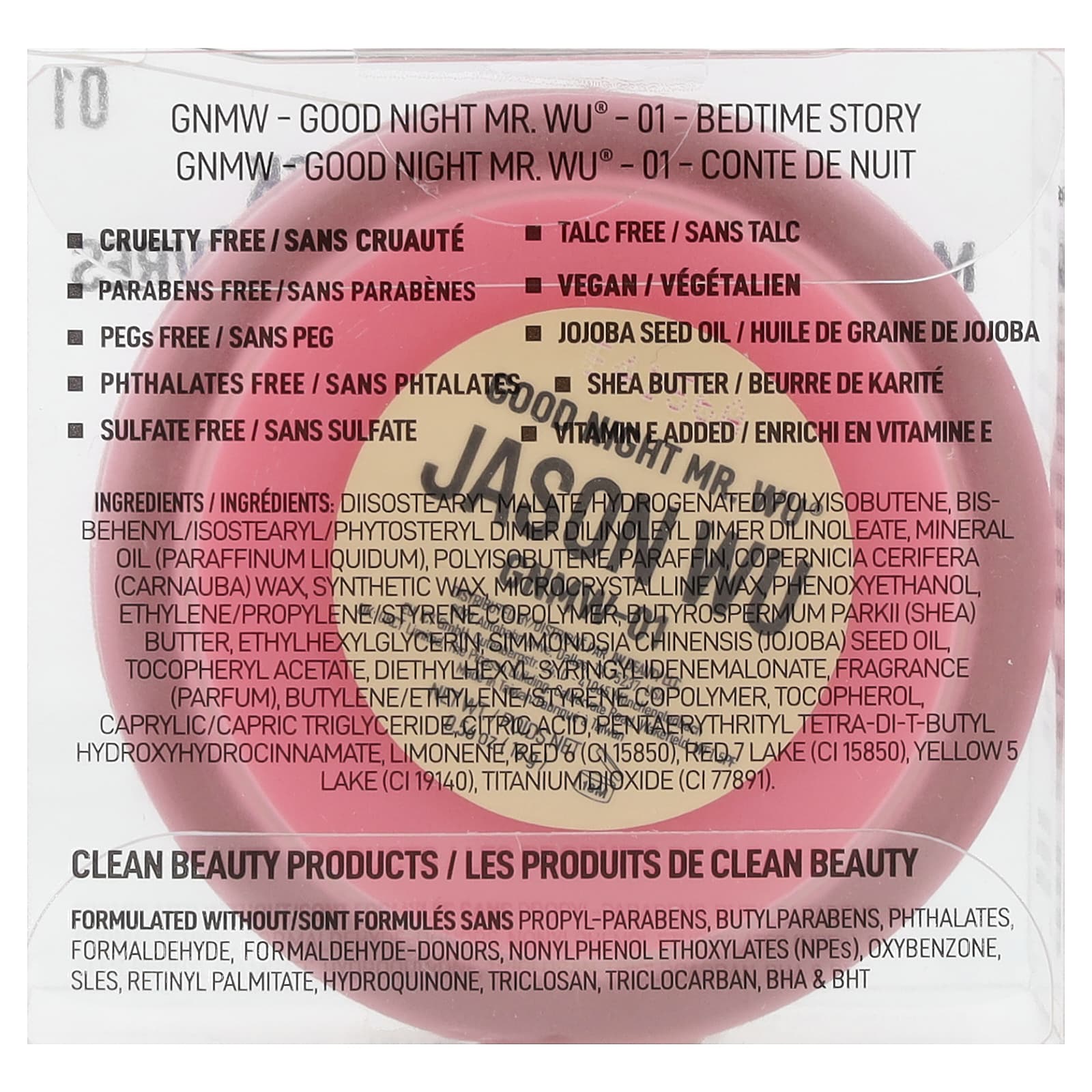 Диизостеарил малат, гидрогенизированный полиизобутен, бисбегенил/изостеарил/фитостерил димер дилинолеил димер дилинолеат, минеральное масло (Paraffinum liquidum), полиизобутен, парафина, карнаубский воск (Copernicia cerifera), синтетический воск, микрокристаллический воск, феноксиэтанол, сополимер этилена/пропилена/стирола, масло ши (Butyrospermum parkii), этилгексилглицерин, масло из семян жожоба (Simmondsia chinensis), токоферилацетат, диэтилгексил сирингилиденемалонат, отдушка (парфюмерная композиция), сополимер бутилена/этилена/стирола, токоферол, каприловый/каприновый триглицерид, лимонная кислота, пентаэритритил тетра-ди-трет-бутил гидроксигидроциннамат, лимонен, краситель красный 6 (CI 15850), краситель красный 7 лак (CI 15850), краситель жёлтый 5 лак (CI 19140), диоксид титана (CI 77891).