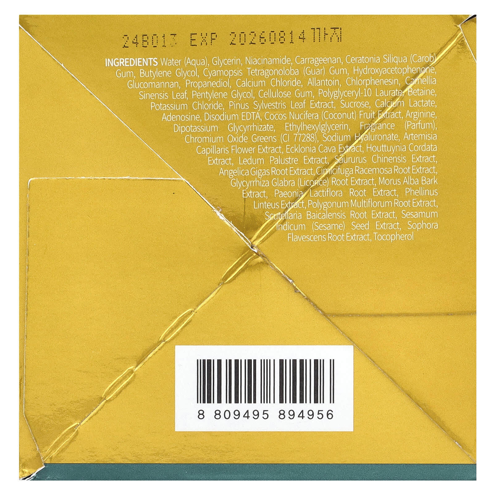 Вода (Aqua), глицерин, никотинамид, каррагинан, камедь рожкового дерева (Ceratonia siliqua), бутиленгликоль, гуаровая камедь (Cyamopsis tetragonoloba), гидроксиацетофенон, глюкоманнан, пропандиол, хлорид кальция, аллантоин, хлорфенезин, листья зеленого чая (Camellia sinensis), пентилен гликоль, целлюлозная камедь, полиглицерил-10 лаурат, бетаин, хлорид калия, экстракт хвои сосны (Pinus sylvestris), сахароза, лактат кальция, аденозин, двунатриевая ЭДТК, экстракт кокоса (Cocos nucifera), аргинин, дикалия глицирризат, этилгексилглицерин, отдушка (отдушка), зелень оксида хрома (CI 77288), гиалуронат натрия, экстракт цветков полыни (Artemisia capillaris), экстракт водоросли эклонии кавы (Ecklonia cava), экстракт хауттюйнии (Houttuynia cordata), экстракт багульника (Ledum palustre), экстракт сычуаньского перца (Saururus chinensis), экстракт корня дудника гигантского (Angelica gigas), экстракт корня клопогона кистевидного (Cimicifuga racemosa), экстракт корня солодки (Glycyrrhiza glabra), экстракт коры шелковицы белой (Morus alba), экстракт корня пиона молочноцветкового (Paeonia lactiflora), экстракт санхвана (Phellinus linteus), экстракт корня горца многоцветкового (Polygonum multiflorum), экстракт корня шлемника (Scutellaria baicalensis), экстракт семян кунжута (Sesamum indicum), экстракт корня софоры желтоватой (Sophora flavescens), токоферол.