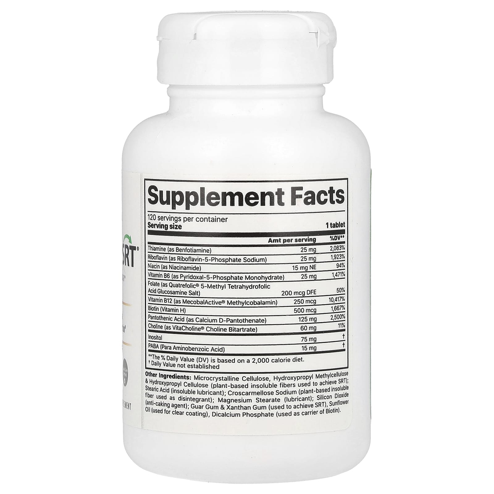 Микрокристаллическая целлюлоза, гидроксипропилметилцеллюлоза и гидроксипропилцеллюлоза (нерастворимые волокна растительного происхождения, используемые для получения SRT); стеариновая кислота (нерастворимая смазка); кроскармеллоза натрия (нерастворимая клетчатка растительного происхождения, используемая в качестве разрыхлителя); стеарат магния (смазка); диоксид кремния (средство, препятствующее слеживанию); гуаровая камедь и ксантановая камедь (используется для получения SRT), подсолнечное масло (используется для прозрачного покрытия), дикальций фосфат (используется в качестве носителя биотина).