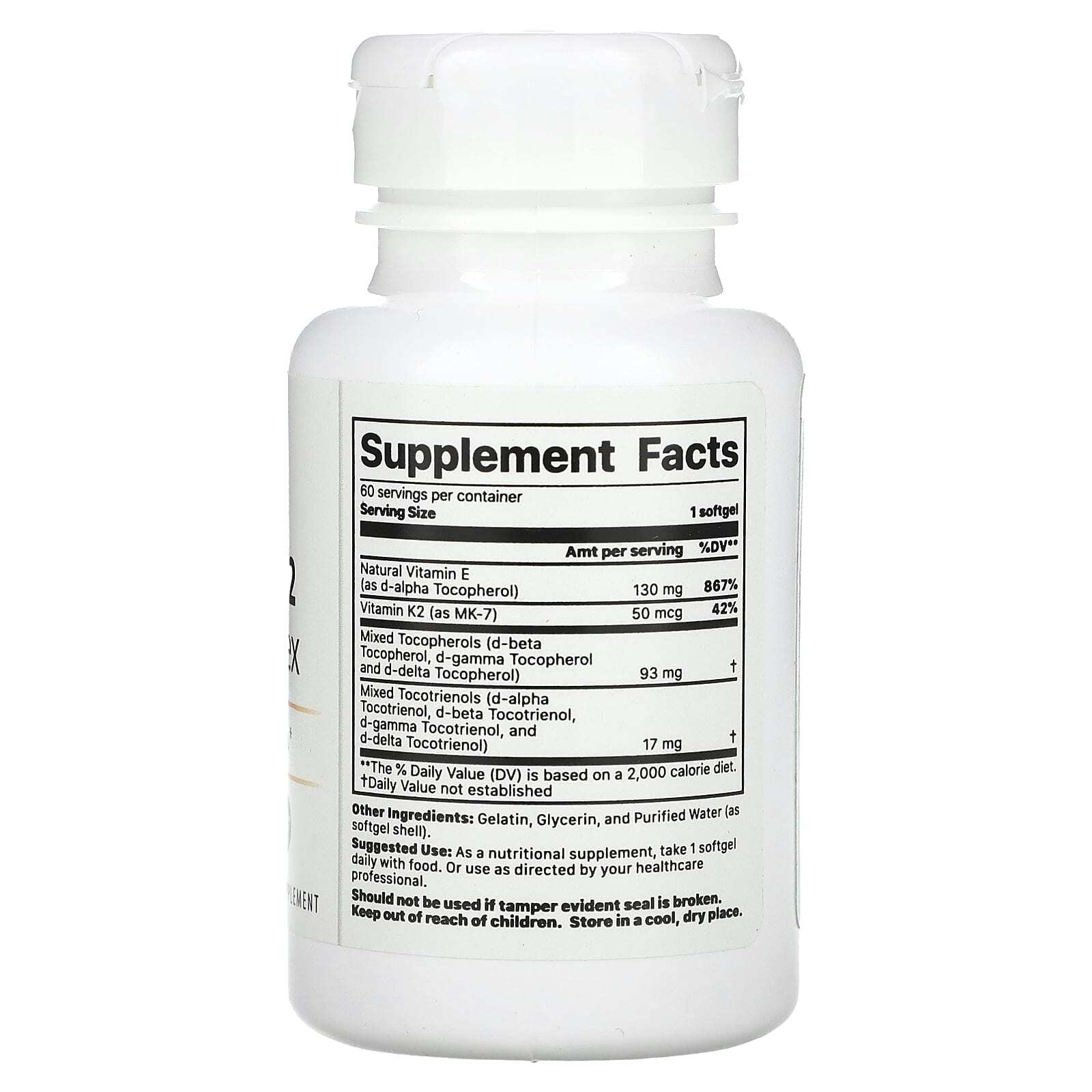Комплекс витаминов K2 + E содержит витамин K2 MenaQ7®, который является наиболее эффективной формой витамина K2, в сочетании с комплексом витаминов E.