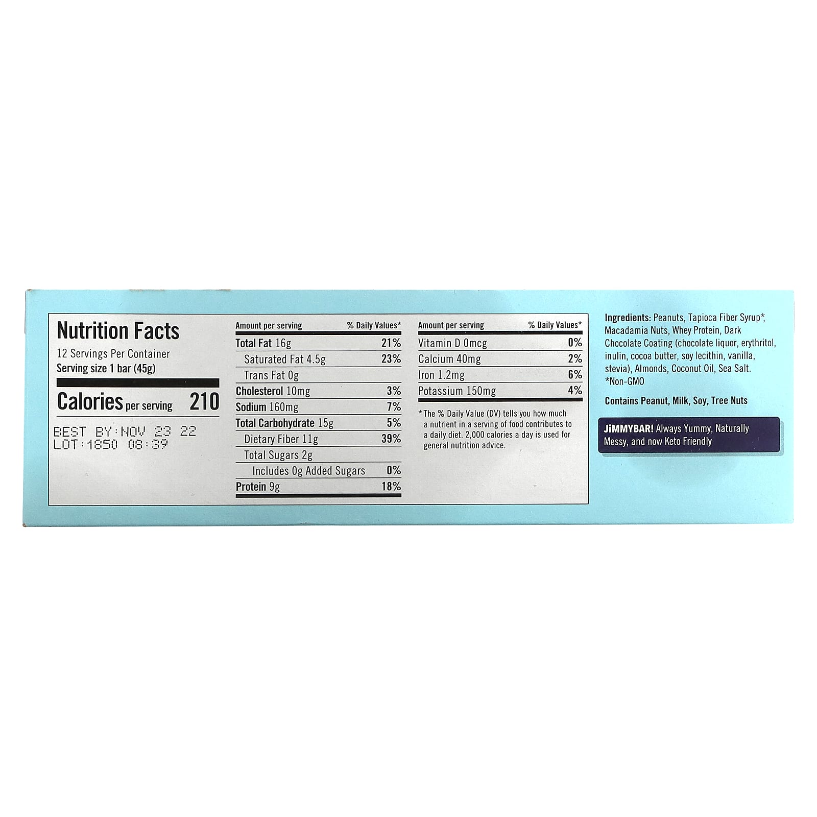 Этот батончик, состоящий из орехов макадамия, миндаля и арахиса с глазурью из темного шоколада, подходит для любителей КЕТО и удовлетворяет ваши пристрастия к сладкому. Все верно - высокое содержание жиров, низкое содержание чистых углеводов, низкое содержание сахара И такой невероятный вкус, что ваши вкусовые рецепторы просто сойдут с ума (в хорошем смысле) от Keto JiMMY! Хрустящие орехи макадамия!