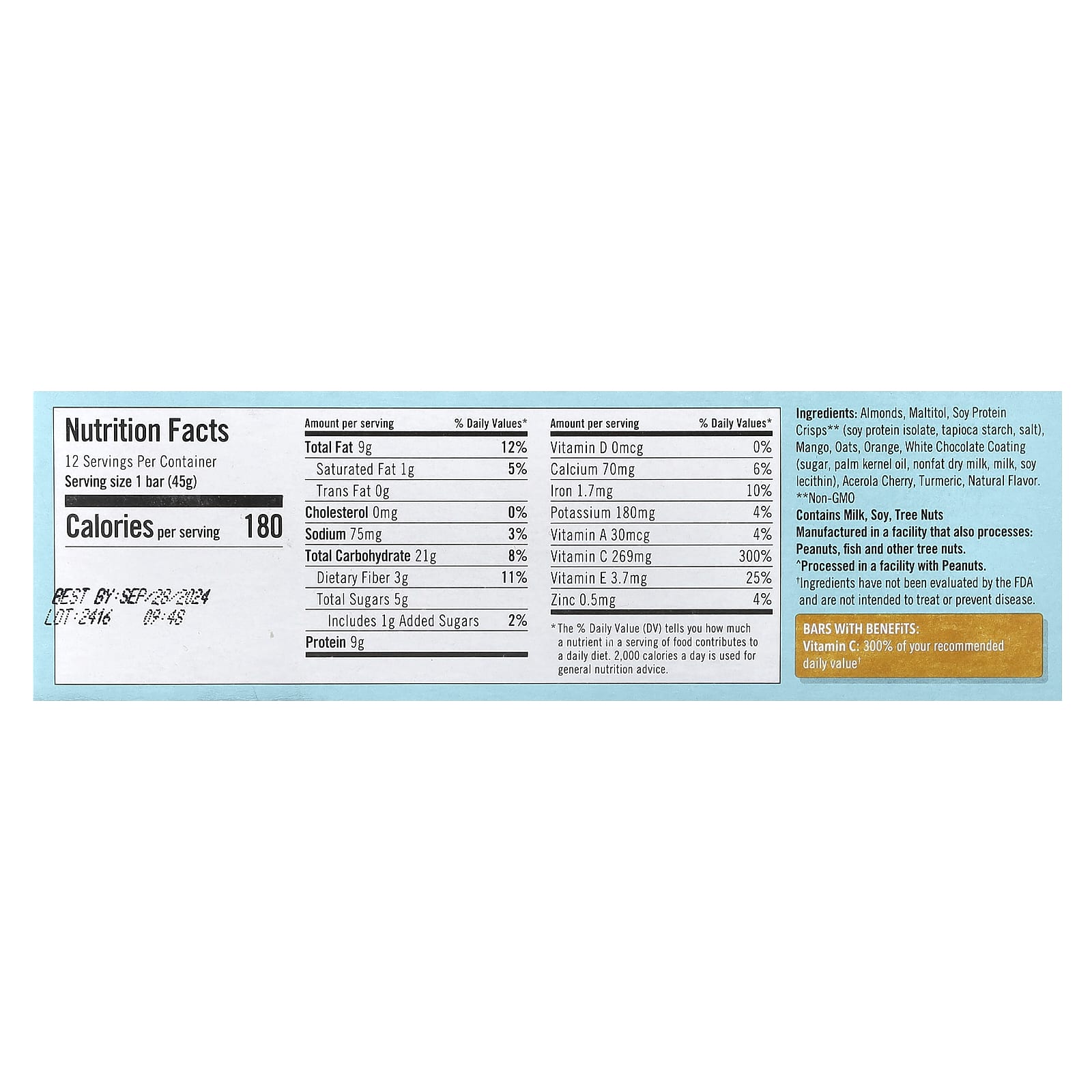 Миндаль, мальтит, чипсы из соевого протеина ** (изолят соевого протеина, тапиоковый крахмал, соль), манго, овес, апельсин, глазурь из белого шоколада (сахар, пальмоядровое масло, обезжиренное сухое молоко, молока, соевый лецитин], ацерола вишня, куркума, натуральный ароматизатор.