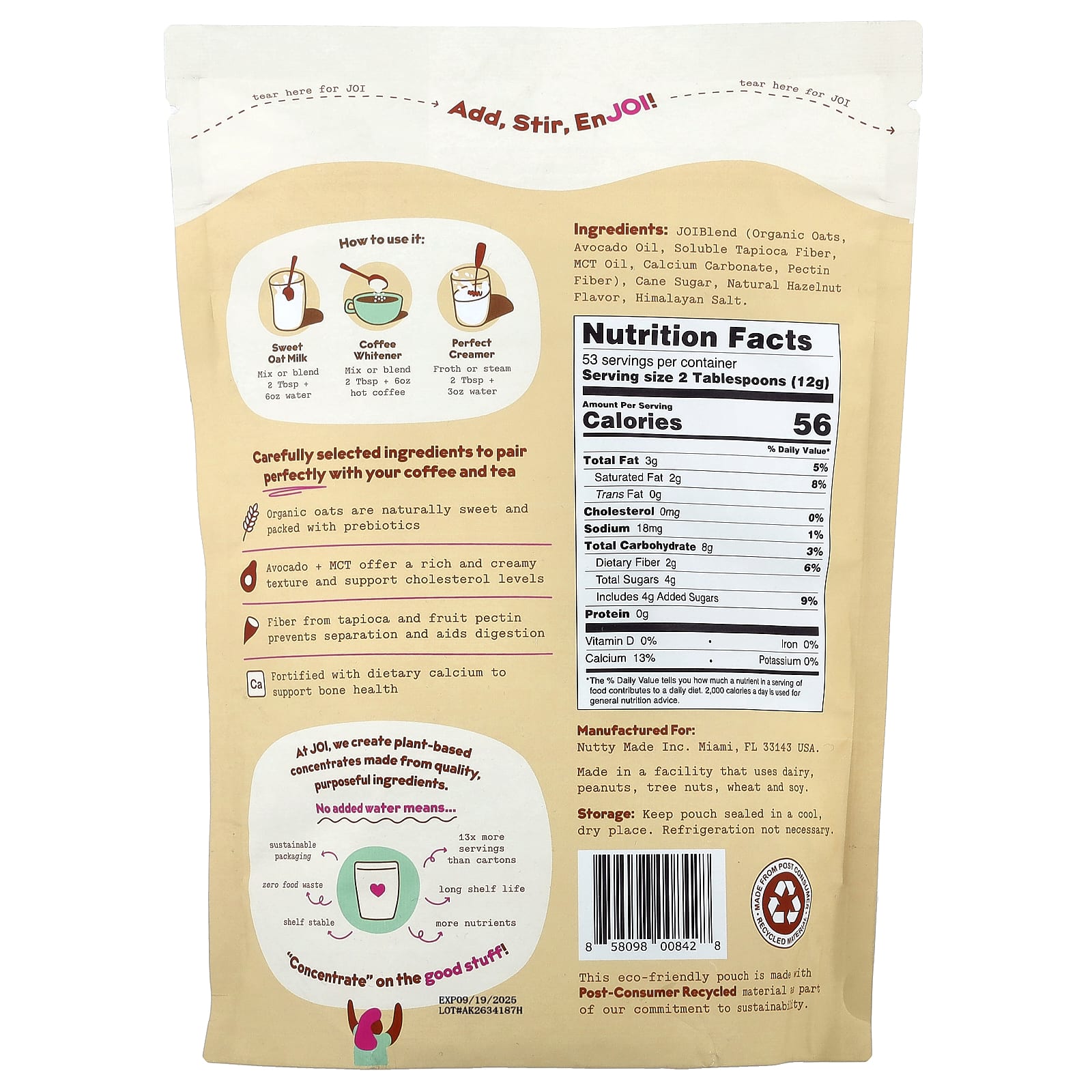 JOIBlend (органический овес, масло авокадо, растворимая тапиоковая клетчатка, масло MCT, карбонат кальция, пектиновая клетчатка), тростниковый сахар, натуральный ароматизатор «Фундук», гималайская соль.