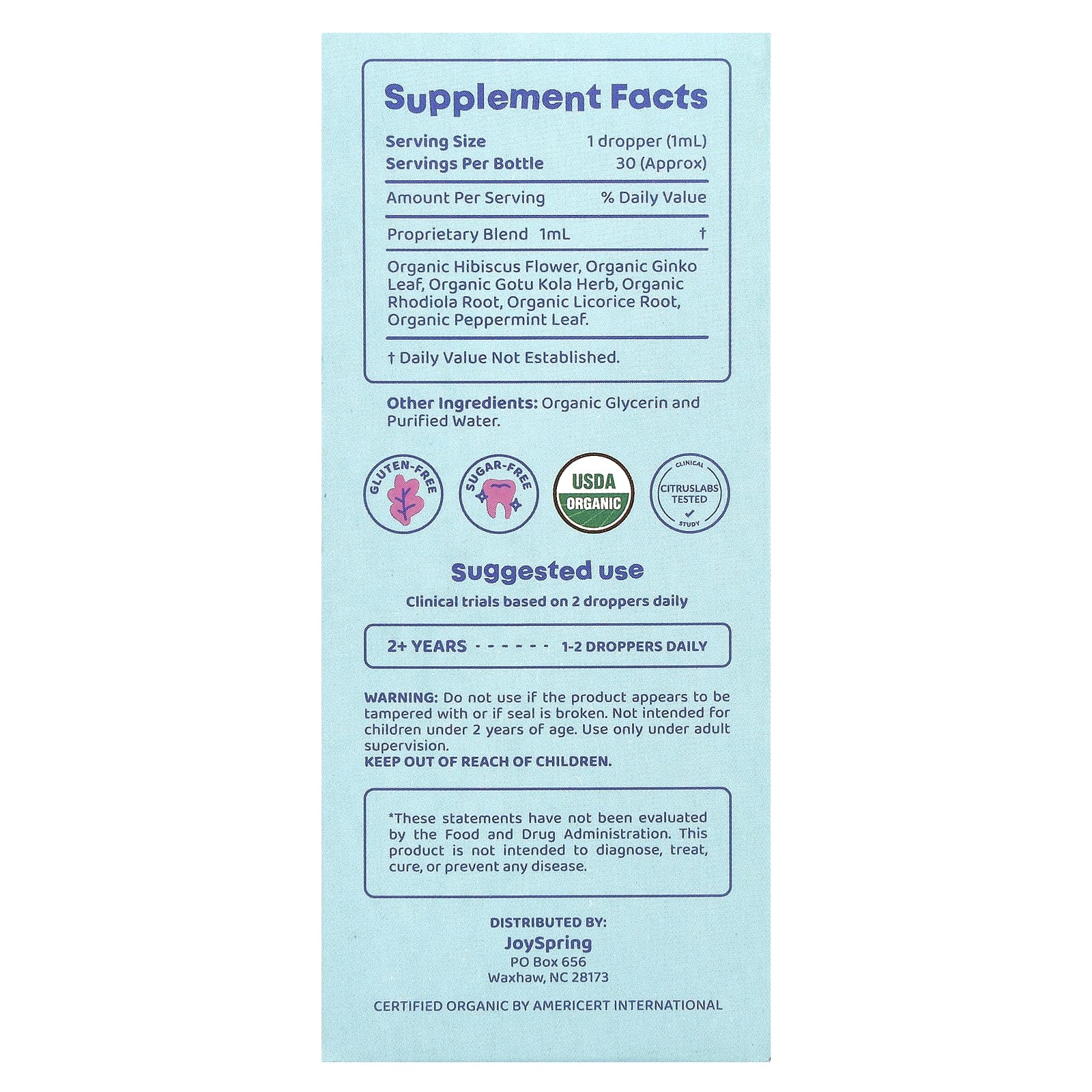 | Запатентованная смесь органические цветы гибискуса, органические листья гинкго билоба, органическая трава готу колы, органический корень родиолы, органический корень солодки, органические листья перечной мяты | 1 мл | † |