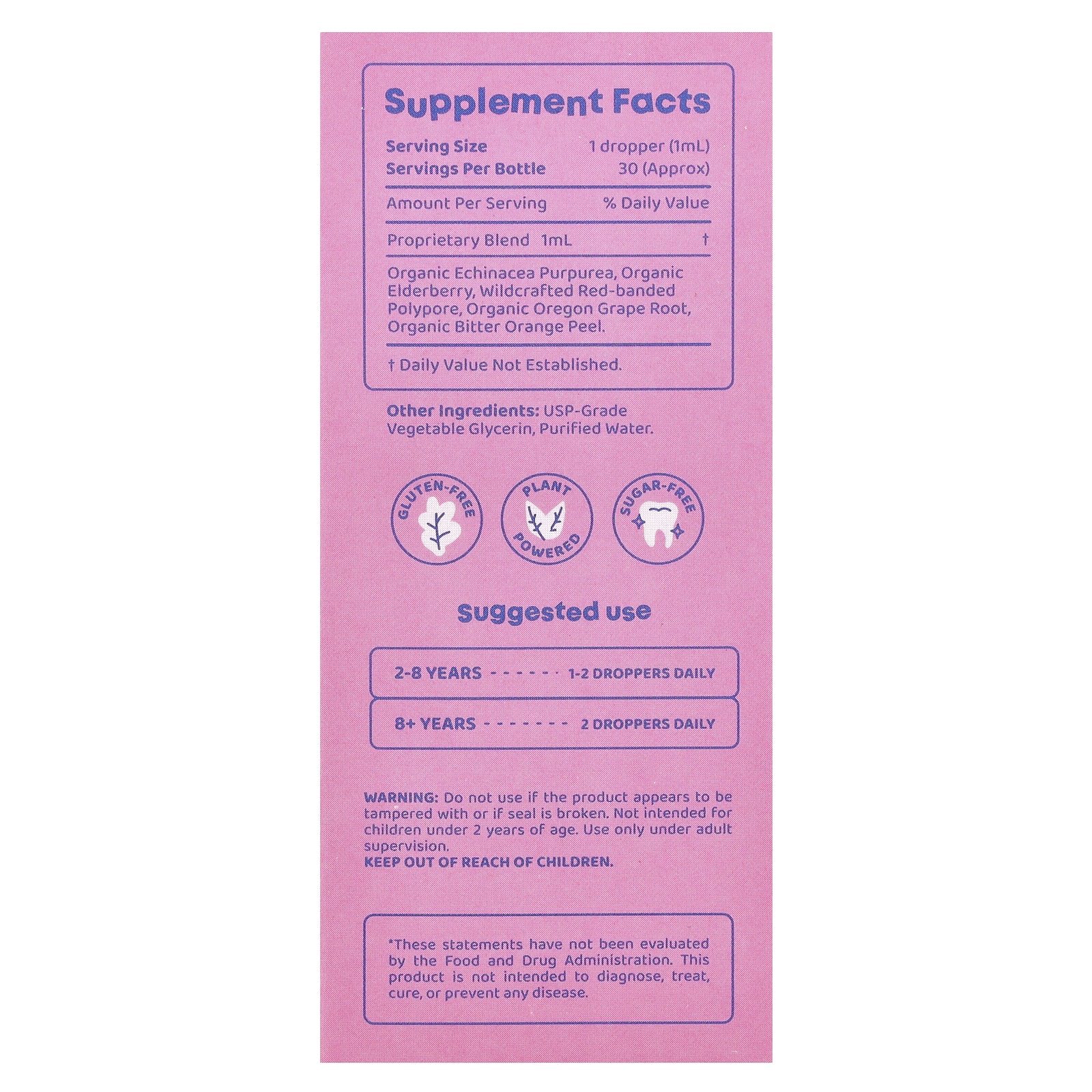 | Запатентованная смесь Органическая эхинацея пурпурная, органическая бузина, дикорастущие краснополостные полипы, корень органического орегонского винограда, органическая цедра горького апельсина | 1 мг | † | † |