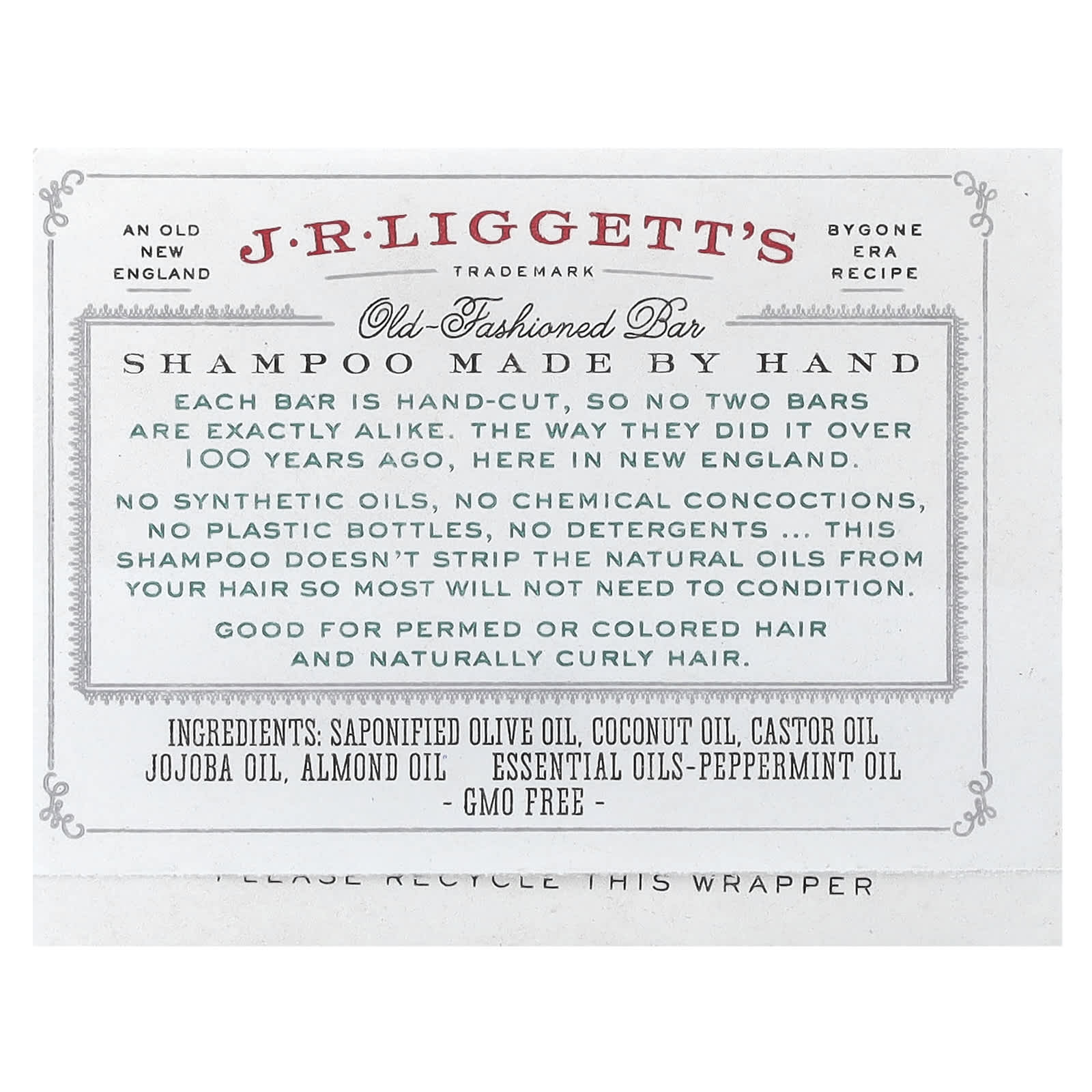 Омыленное оливковое масло, кокосовое масло, касторовое масло, масло жожоба, миндальное масло, эфирные масла — масло перечной мяты.