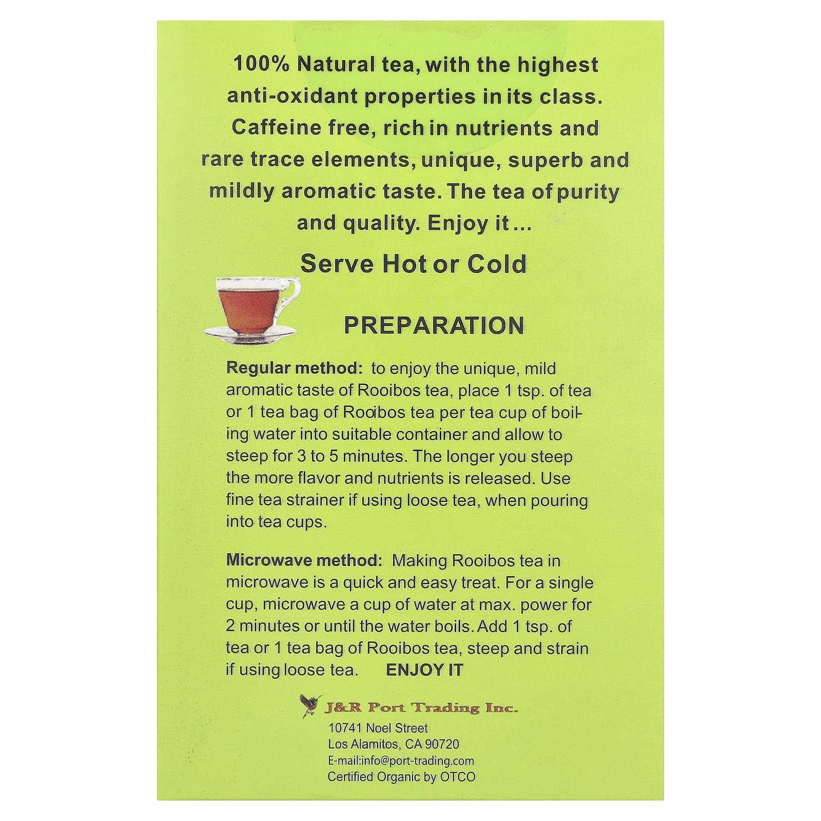 Полностью натуральный чай с сильнейшими антиоксидантными свойствами среди продуктов подобного класса. Без кофеина, содержит большое количество питательных веществ и редких микроэлементов, обладает уникальным превосходным вкусом и легким ароматом. Чистый и качественный чай. Наслаждайтесь! Можно употреблять в горячем или холодном виде.