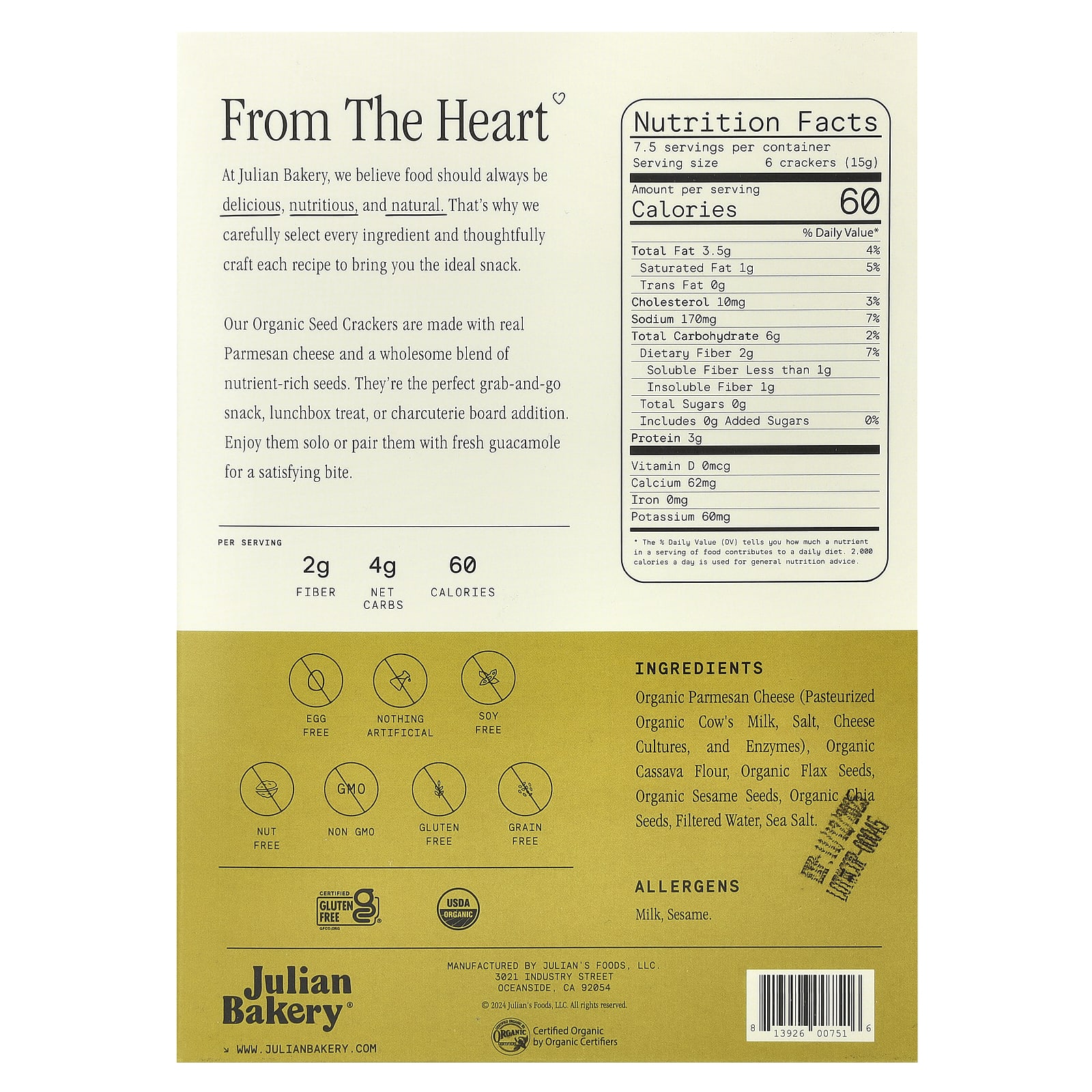 органический сыр пармезан (пастеризованное органическое коровье молоко, соль, культуры для сыра, ферменты), органическая мука из кассавы, органические семена льна, органические семена кунжута, органические семена чиа, очищенная вода, морская соль.