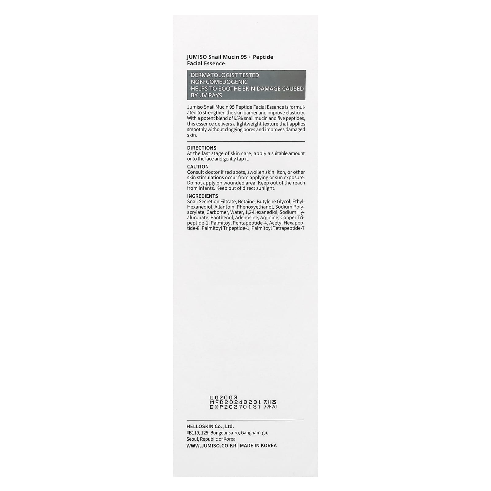 Пептидная эссенция для лица с муцином улитки Jumiso Snail Mucin 95 разработана для укрепления кожного барьера и повышения эластичности. Эта эссенция, состоящая из 95% муцина улитки и пяти пептидов, обеспечивает легкую текстуру, которая мягко наносится, не забивая поры, и улучшает поврежденную кожу.