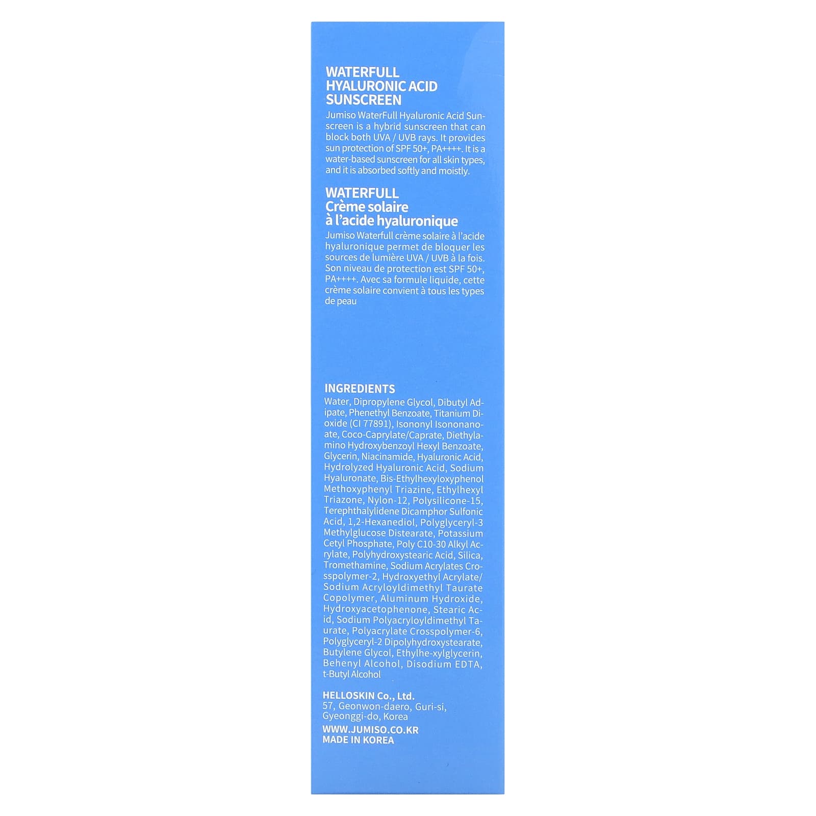 Солнцезащитное средство с гиалуроновой кислотой Jumiso WaterFull - это гибридное солнцезащитное средство, которое может блокировать как лучи UVA, так и UVB. Обеспечивает защиту от солнца SPF 50+, PA ++++. Это солнцезащитное средство на водной основе для всех типов кожи, которое мягко и влажно впитывается.