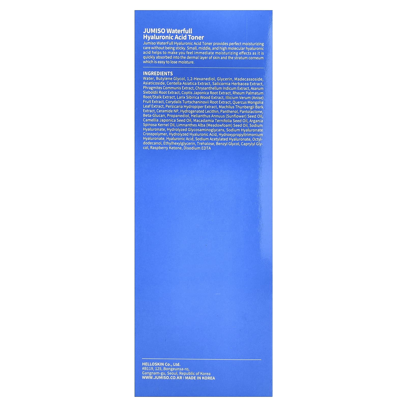Тонер с гиалуроновой кислотой Jumiso WaterFull обеспечивает идеальный увлажняющий уход без ощущения липкости. Низко-, средне- и высокомолекулярная гиалуроновая кислота помогает обеспечить мгновенный эффект увлажнения, поскольку она быстро впитывается в дермальный слой кожи и роговой слой, который легко теряет влагу.
