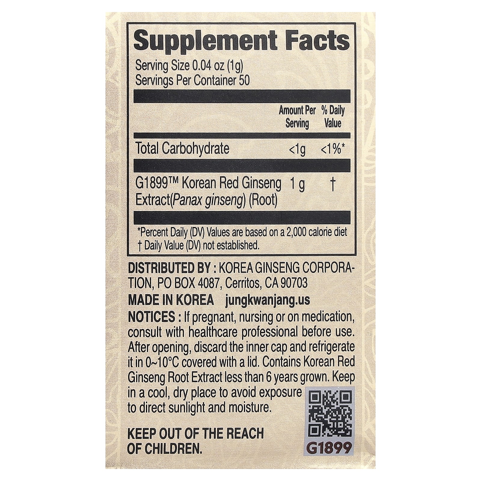 Примечания. Перед применением добавки во время беременности, кормления грудью или приема препаратов следует проконсультироваться с медицинским работником. После вскрытия упаковки продукт следует хранить в холодильнике при температуре 0–10 °C под крышкой. Содержит экстракт корня корейского красного женьшеня, выращенного не более 6 лет. Хранить в сухом и прохладном месте, избегать попадания прямых солнечных лучей и влаги.