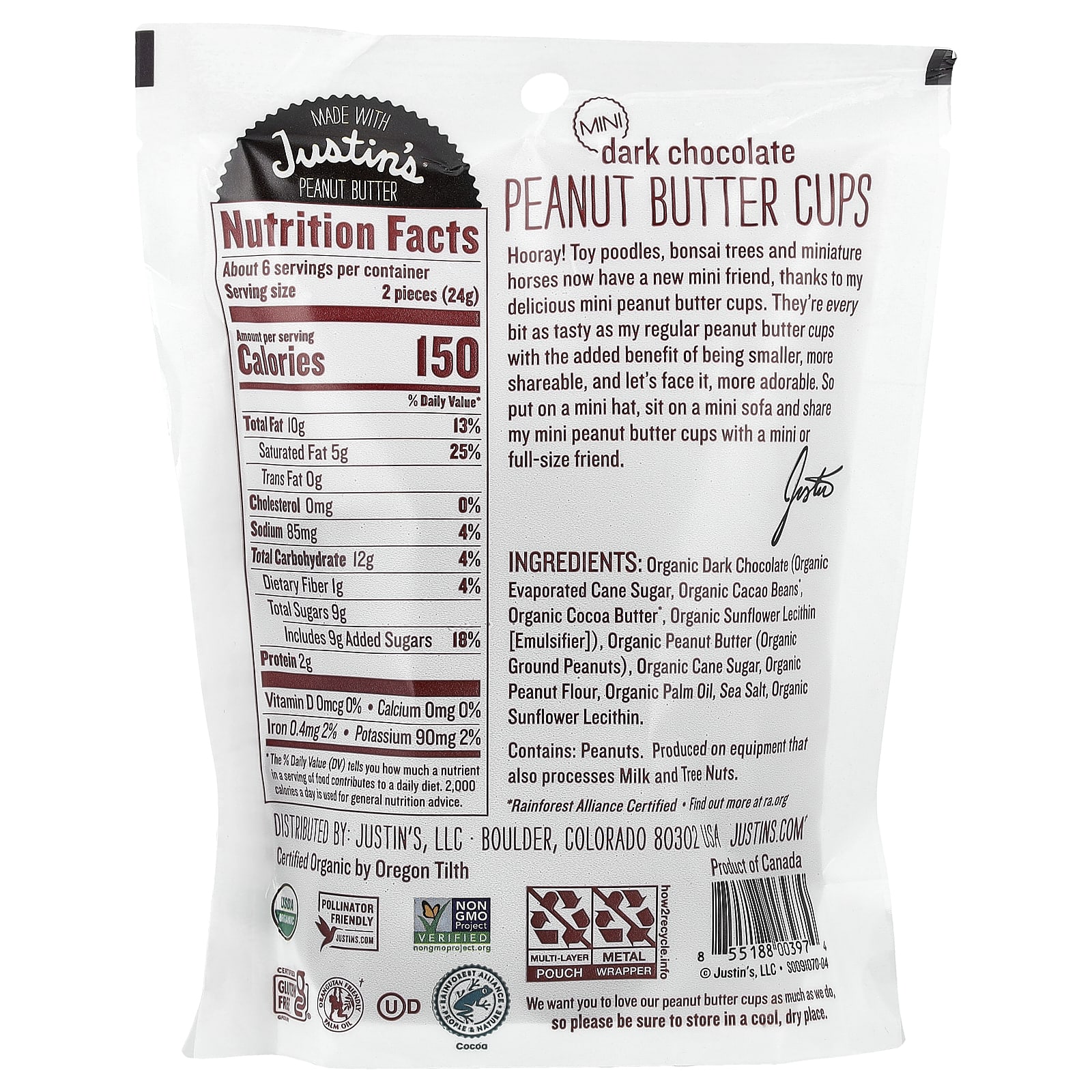 Органический темный шоколад (органический тростниковый сахар, органические какао-бобы *, органическое какао-масло*, органический подсолнечный лецитин [эмульгатор]), органическое арахисовое масло (органический молотый арахис), органический тростниковый сахар, органическая арахисовая мука, органическое пальмовое масло, морская соль, органический подсолнечный лецитин.