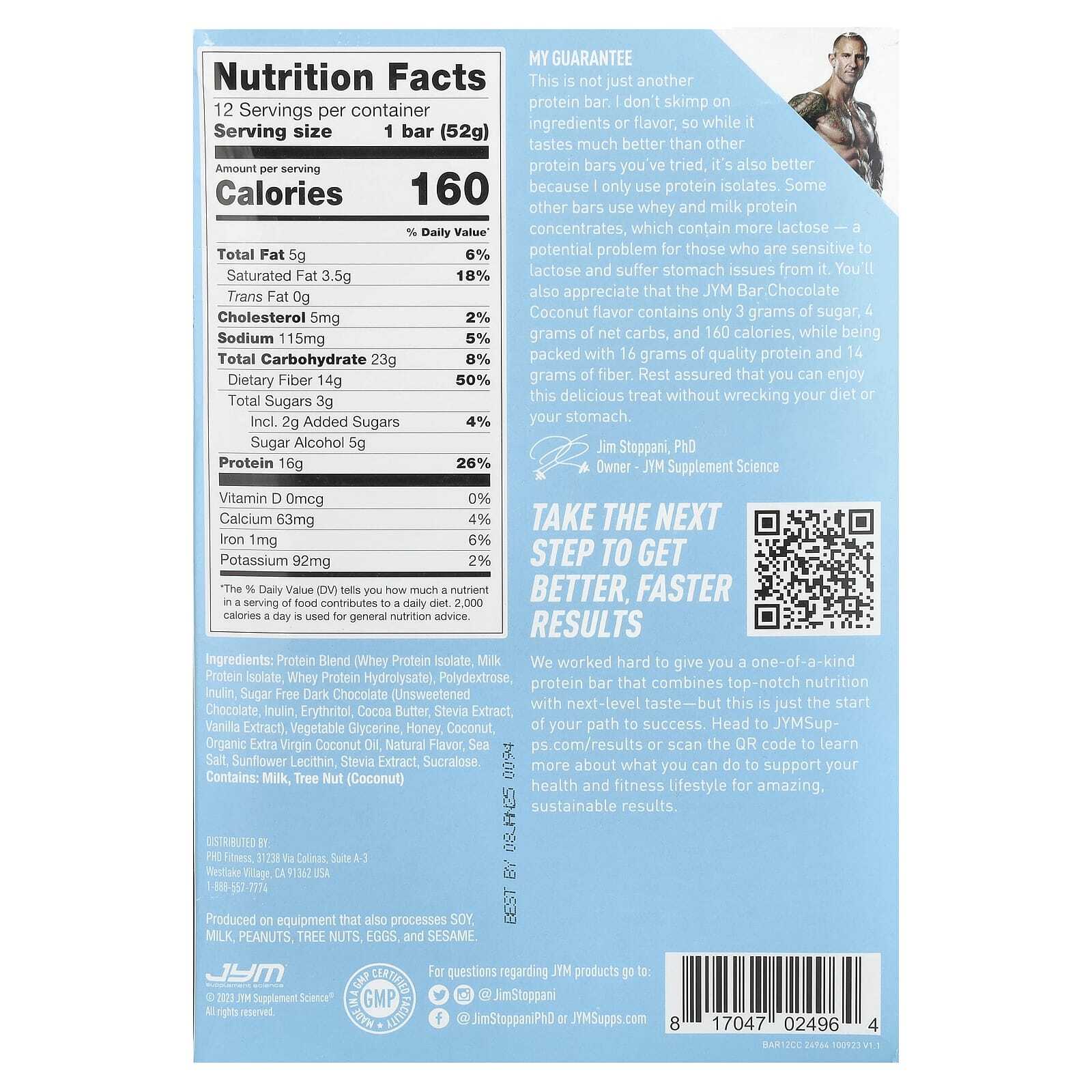 Это не просто очередной протеиновый батончик. Я не экономлю на ингредиентах и вкусе, поэтому, хотя он намного вкуснее, чем другие протеиновые батончики, которые вы пробовали, он также лучше, потому что я использую только изоляты белка. В некоторых других батончиках используются концентраты сывороточного и молочного протеина, которые содержат больше лактозы - потенциальная проблема для тех, кто чувствителен к лактозе и страдает от нее. Вы также оцените, что шоколадно-кокосовый батончик JYM содержит всего 3 грамма сахара, 4 грамма чистых углеводов и 160 калорий, а также 16 граммов качественного белка и 14 граммов клетчатки. Будьте уверены, вы сможете насладиться этим восхитительным лакомством, не нарушая при этом ни свой рацион, ни желудок.