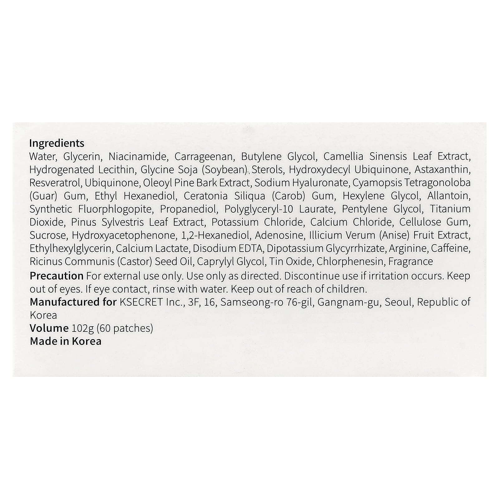 Вода, глицерин, никотинамид, каррагинан, бутиленгликоль, экстракт листьев зелёного чая (Camellia sinensis), гидрогенизированный лецитин, сои (Glycine soja). стеролов, гидроксидецил убихинон, астаксантин, ресвератрол, убихинон, олеоил экстракт сосновой коры, гиалуронат натрия, гуаровая камедь (Cyamopsis tetragonoloba), этил гександиол, камедь рожкового дерева (Ceratonia siliqua), гексиленгликоль, аллантоин, синтетический фторфлогопит, пропандиол, полиглицерил-10 лаурат, пентилен гликоль, диоксид титана, экстракт хвои сосны (Pinus sylvestris), хлорид калия, хлорид кальция, целлюлозная камедь, сахароза, гидроксиацетофенон, 1,2-гександиол, аденозин, экстракт плодов аниса звездчатого (Illicium verum), этилгексилглицерин, лактат кальция, двунатриевая ЭДТК, дикалия глицирризат, аргинин, кофеин, касторовое масло (Ricinus communis), каприлилгликоль, оксид олова, хлорфенезин, отдушка.