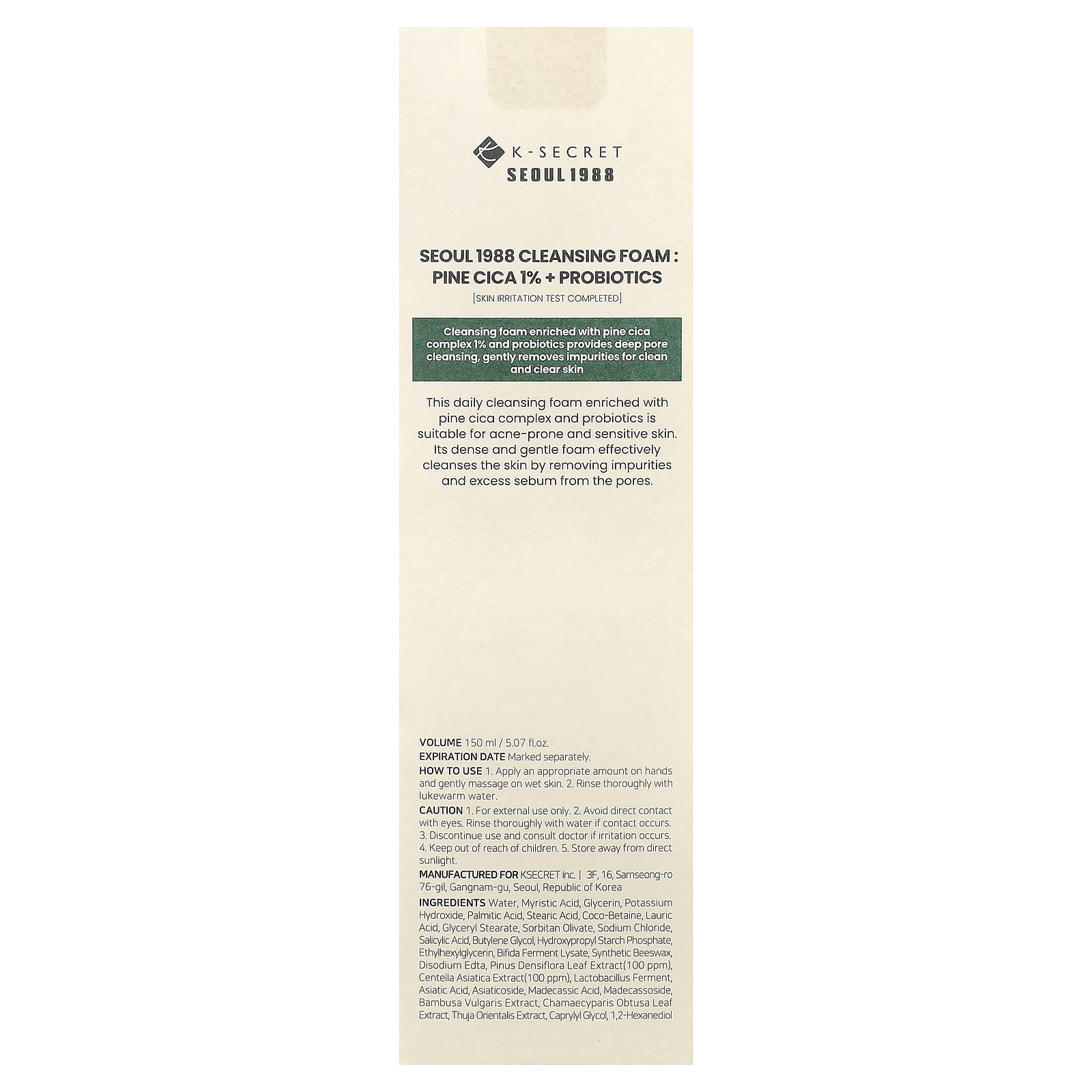 Вода, миристиновая кислота, глицерин, гидроксид калия, пальмитиновая кислота, стеариновая кислота, коко-бетаин, лауриновая кислота, глицерил стеарат, сорбитан оливат, хлорид натрия, салициловая кислота, бутиленгликоль, гидроксипропил фосфат крахмала, этилгексилглицерин, лизат ферментов бифидобактерий, синтетический воск, двунатриевая ЭДТК, экстракт хвои мелкоцветной (Pinus densiflora) (100 част./млн), экстракт готу колы (Centella asiatica) (100 част./млн), фермент лактобактерий (Lactobacillus), азиатиковая кислота, азиатикозид, мадекассовая кислота, мадекассосид, экстракт бамбука (Bambusa vulgaris), экстракт листьев кипарисовика (Chamaecyparis obtusa), экстракт туи восточной (Thuja orientalis), каприлилгликоль, 1,2-гександиол.