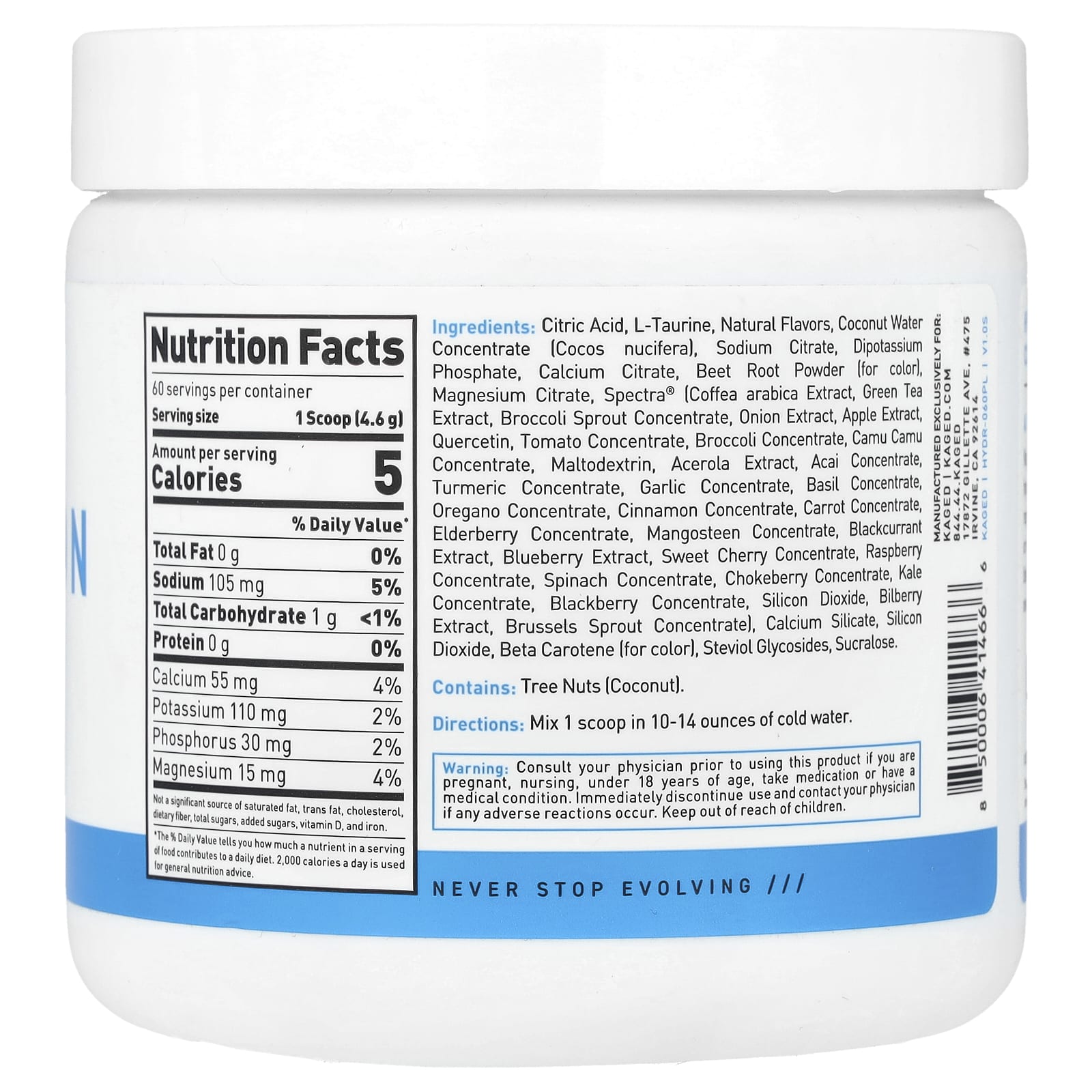 Kaged Hydration - это восхитительный напиток с электролитами, который поддерживает водный баланс без сахара. Это освежающий способ пополнить баланс жидкости во время тренировок, в рабочие дни или на выходных. Кроме того, мы добавили SPECTRA®, премиальную смесь из 29 экстрактов фруктов, овощей и трав, а также таурина для общей поддержки здоровья.