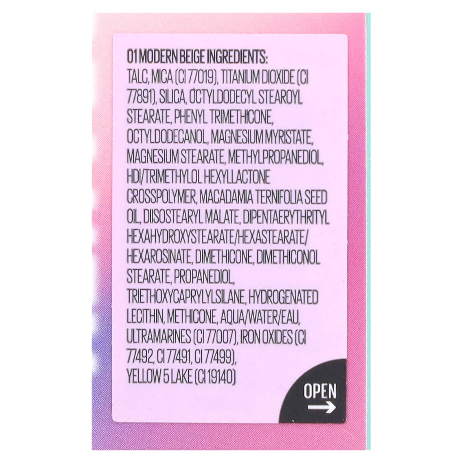 01 бежевый Тальк, слюда (CI 77019), диоксид титана (CI 77891), диоксид кремния, октилдодецил стеароил стеарат, фенилтриметикон, октилдодеканол, миристат магния, стеарат магния, метилпропандиол, HDI/триметилол гексалактон кроссполимер, масло макадамии (Macadamia ternifolia), диизостеарил малат, дипентаэритритил гексагидроксистеорат/гексастерат/гексаросинат, диметикон, диметиконол стеарат, пропандиол, триэтоксикаприлилсилан, гидрогенизированный лецитин, метикон, вода, ультрамарины (CI 77007), оксиды железа (CI 77492, CI 77491, CI 77499), краситель желтый 5 лак (CI 19140)