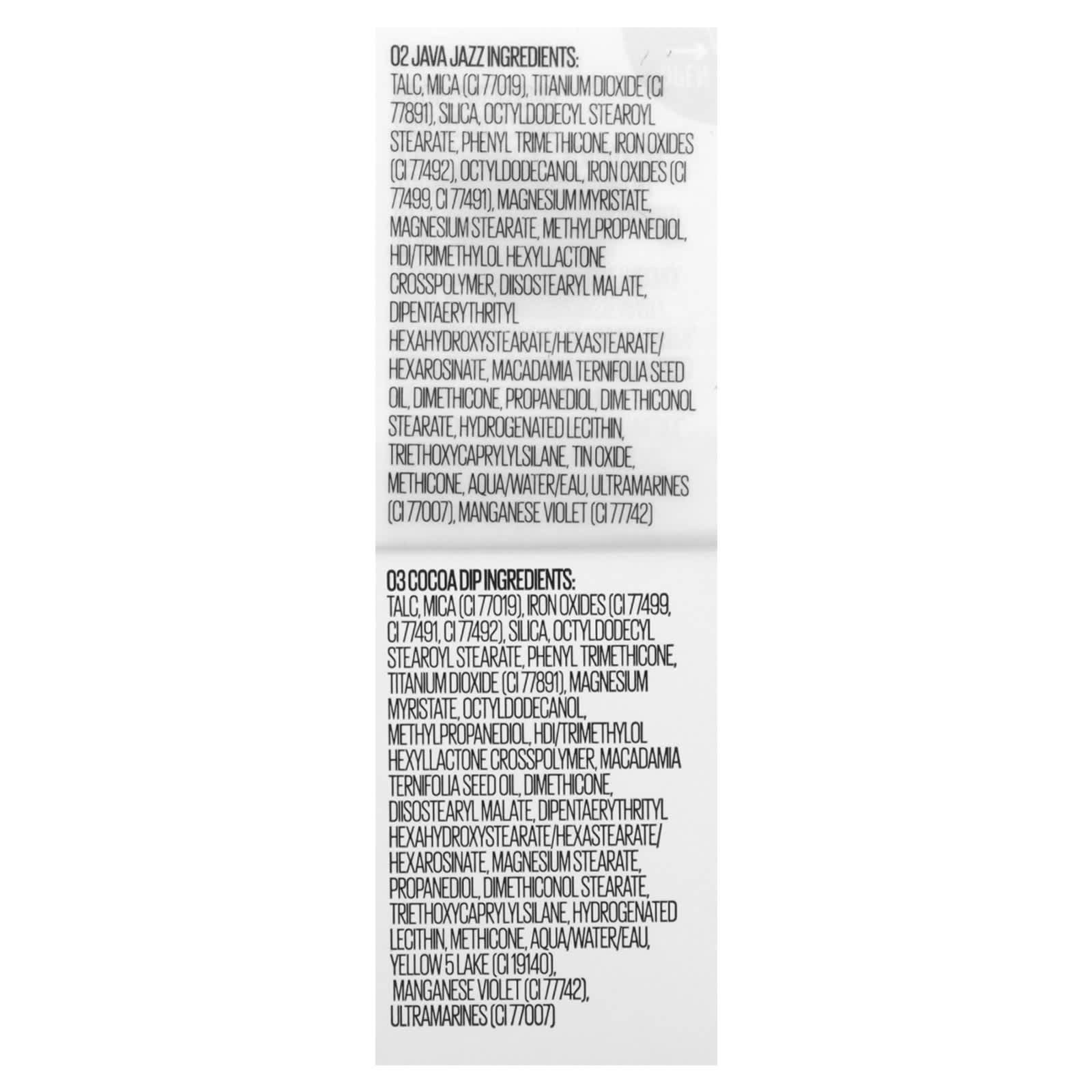 03 какао-дип: Тальк, слюда (CI 77019), оксиды железа (CI 77499, CI 77491, CI 77492), диоксид кремния, октилдодецил стеароил стеарат, фенилтриметикон, диоксид титана (CI 77891), миристат магния, октилдодеканол, метилпропандиол, HDI/триметилол гексалактон кроссполимер, масло макадамии (Macadamia ternifolia), диметикон, диизостеарил малат, дипентаэритритил гексагидроксистеорат/гексастерат/гексаросинат, стеарат магния, пропандиол, диметиконол стеарат, триэтоксикаприлилсилан, гидрогенизированный лецитин, метикон, вода, краситель желтый 5 лак (CI 19140), краситель темно-фиолетовый (CI 77742), ультрамарин (CI 77007).
