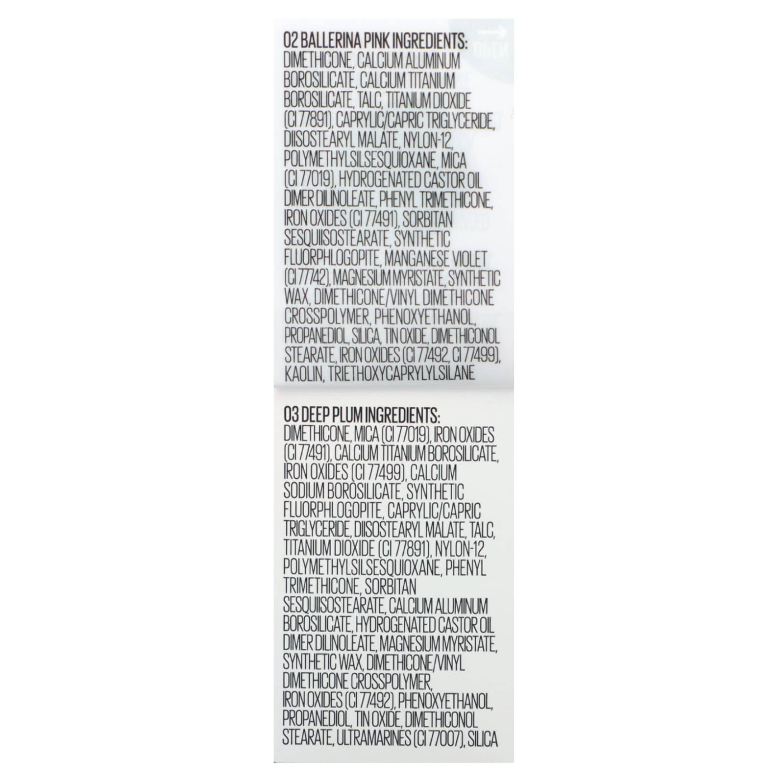 02 розовый (Ballerina Pink): диметикон, кальций алюминий боросиликат, боросиликат кальция и титана, тальк, диоксид титана (CI 77891), каприловый/каприновый триглицерид, диизостеарил малат, нейлон-12, полиметилсилсесквиоксан, слюда (CI 77019), гидрогенизированное касторовое масло димердилинолеат, фенилтриметикон, оксиды железа (CI 77491), сорбитан сесквиизостеарат, синтетический фторфлогопит, краситель темно-фиолетовый (CI 77742), миристат магния, синтетический воск, диметикон/винил диметикон кроссполимер, феноксиэтанол, пропандиол, диоксид кремния, оксид олова, диметиконол стеарат, оксиды железа (CI 77492, CI 77499), каолин, триэтоксикаприлилсилан