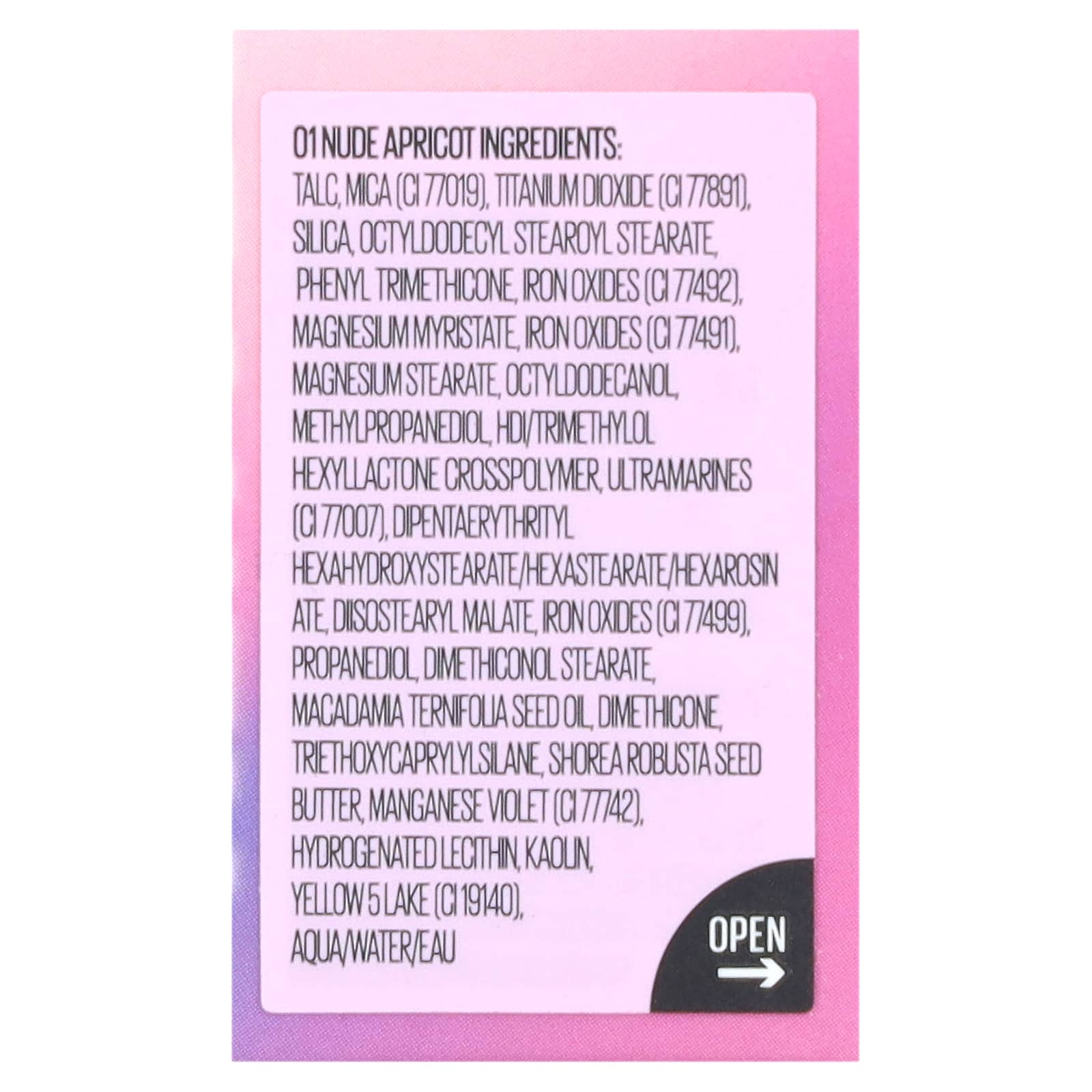 01 абрикосовый нюдовый: Тальк, слюда (CI 77019), диоксид титана (CI 77891), диоксид кремния, октилдодецил стеароил стеарат, фенилтриметикон, оксиды железа (CI 77492), миристат магния, оксиды железа (CI 77491), стеарат магния, октилдодеканол, метилпропандиол, HDI/триметилол гексалактон кроссполимер, ультрамарины (CI 77007), дипентаэритритил гексагидроксистеорат/гексастерат/гексаросинат, диизостеарил малат, оксиды железа (CI 77499), пропандиол, диметиконол стеарат, масло макадамии (Macadamia ternifolia), диметикон, триэтоксикаприлилсилан, масло салового дерева (Shorea robusta), краситель темно-фиолетовый (CI 77742), гидрогенизированный лецитин, каолин, краситель желтый 5 лак (CI 19140), воды.