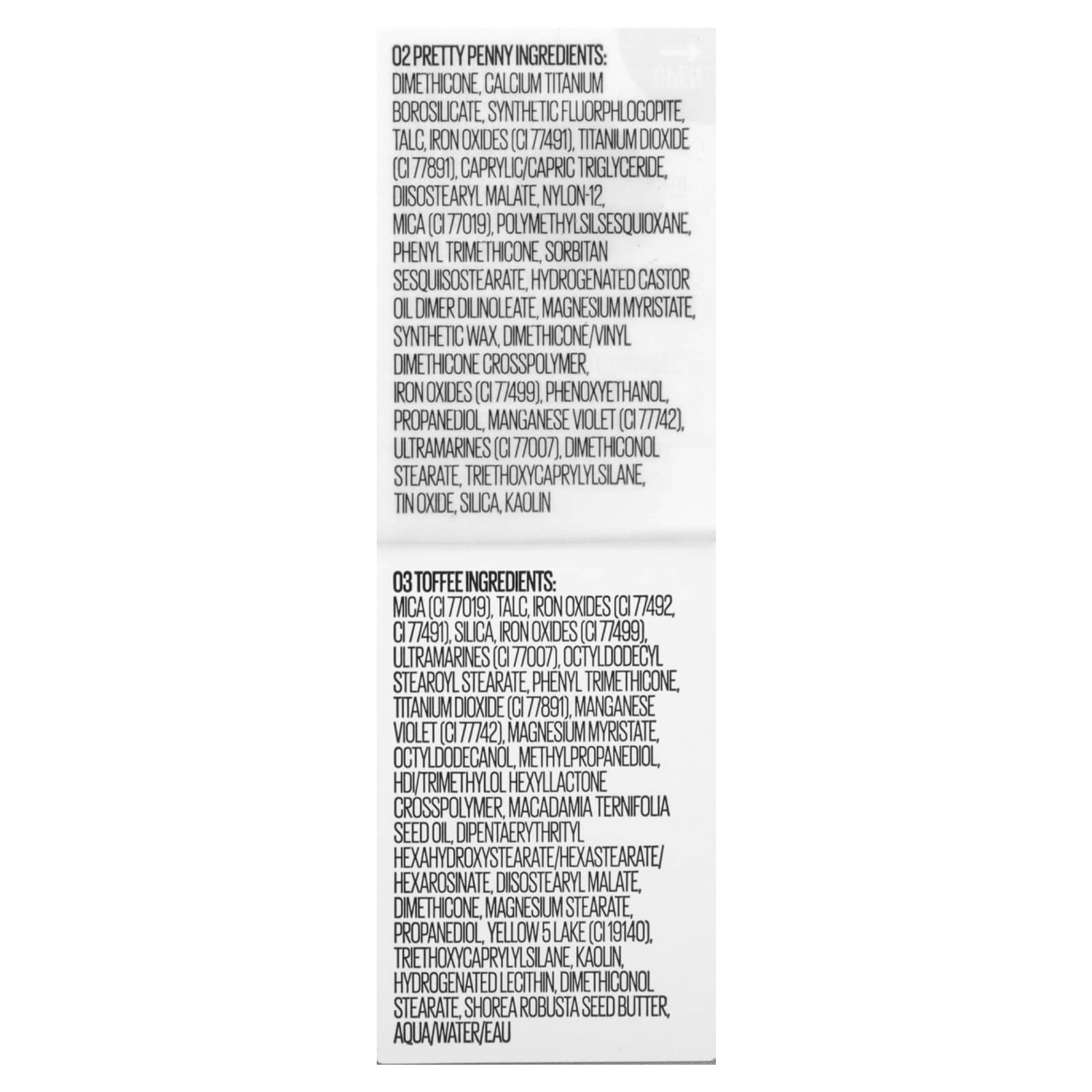 02 пенни: диметикон, боросиликат кальция и титана, синтетический фторфлогопит, тальк, оксиды железа (CI 77491), диоксид титана (CI 77891), каприловый/каприновый триглицерид, диизостеарил малат, нейлон-12, слюда (CI 77019), полиметилсилсесквиоксан, фенилтриметикон, сорбитан сесквиизостеарат, гидрогенизированное касторовое масло димердилинолеат, миристат магния, синтетический воск, диметикон/винил диметикон кроссполимер, оксиды железа (CI 77499), феноксиэтанол, пропандиол, краситель темно-фиолетовый (CI 77742), ультрамарины (CI 77007), диметиконол стеарат, триэтоксикаприлилсилан, оксид олова, диоксид кремния, каолин.