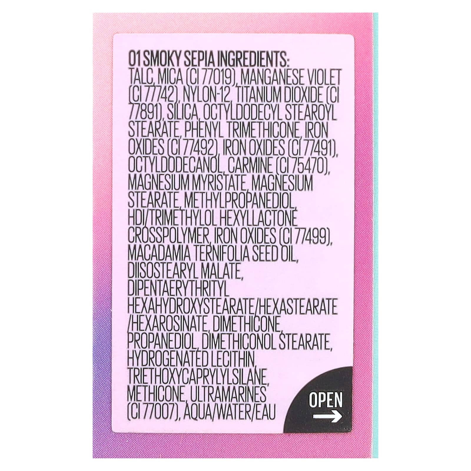 01 дымчатая сепия: Тальк, слюда (CI 77019), краситель темно-фиолетовый (CI 77742), нейлон-12, диоксид титана (CI 77891), диоксид кремния, октилдодецил стеароил стеарат, фенилтриметикон, оксиды железа (CI 77492), оксиды железа (CI 77491), октилдодеканол, кармин (CI 75470), миристат магния, стеарат магния, метилпропандиол, гександиизоцианат/триметилол хексиллактона кроссполимер, оксиды железа (CI 77499), масло макадамии (Macadamia ternifolia), диизостеарил малат, дипентаэритритил гексагидроксистеорат/гексастерат/гексаросинат, диметикон, пропандиол, диметиконол стеарат, гидрогенизированный лецитин, триэтоксикаприлилсилан, метикон, ультрамарины (CI 77007), вода.
