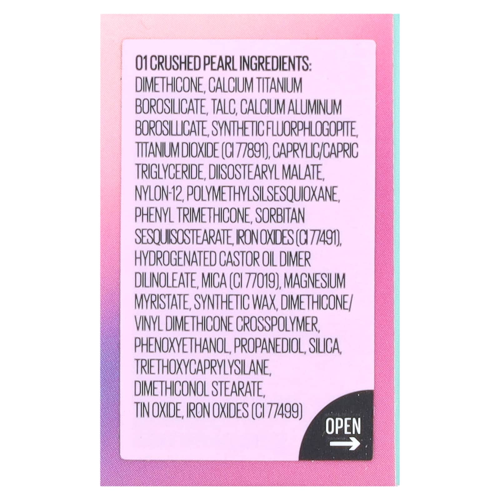 01 жемчужный: диметикон, боросиликат кальция и титана, тальк, кальций алюминий боросиликат, синтетический фторфлогопит, диоксид титана (CI 77891), каприловый/каприновый триглицерид, диизостеарил малат, нейлон-12, полиметилсилсесквиоксан, фенилтриметикон, сорбитан сесквиизостеарат, оксиды железа (CI 77491), гидрогенизированное касторовое масло димердилинолеат, слюда (CI 77019), миристат магния, синтетический воск, диметикон/винил диметикон кроссполимер, феноксиэтанол, пропандиол, диоксид кремния, триэтоксикаприлилсилан, диметиконол стеарат, оксид олова, оксиды железа (CI 77499).