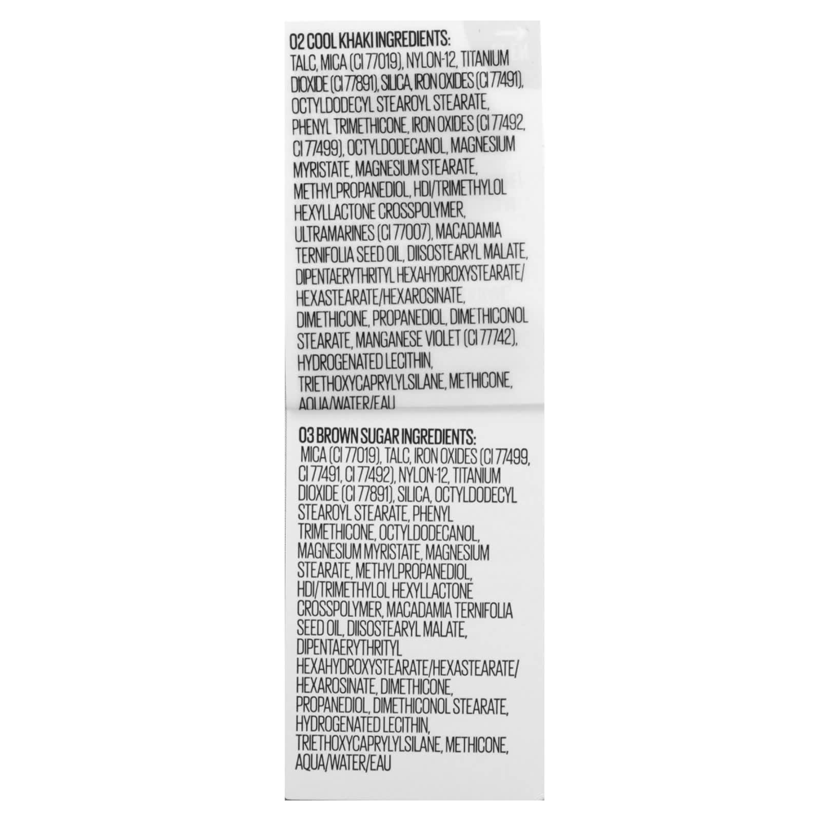 02 холодный хаки: Тальк, слюда (CI 77019), нейлон-12, диоксид титана (CI 77891), диоксид кремния, оксиды железа (CI 77491), октилдодецил стеароил стеарат, фенилтриметикон, оксиды железа (CI 77492, CI 77499), октилдодеканол, миристат магния, стеарат магния, метилпропандиол, HDI/триметилол гексалактон кроссполимер, ультрамарины (CI 77007), масло макадамии (Macadamia ternifolia), диизостеарил малат, дипентаэритритил гексагидроксистеорат/гексастерат/гексаросинат, диметикон, пропандиол, диметиконол стеарат, краситель темно-фиолетовый (CI 77742), гидрогенизированный лецитин, триэтоксикаприлилсилан, метикон, воды.