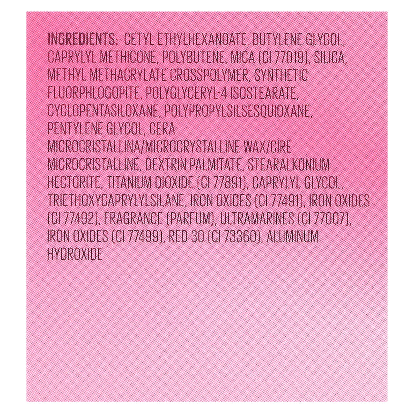 Цетил этилгексаноат, бутиленгликоль, каприлил метикон, полибутен, слюда (CI 77019), диоксид кремния, метил метакрилат кроссполимер, синтетический фторфлогопит, полиглицерил-4 изостеарат, циклопентасилоксан, полипропилсилсесквиоксан, пентилен гликоль, микрокристаллический воск (Cera microcristallina), декстрин пальмитат, стеаралкония гекторит, диоксид титана (CI 77891), каприлилгликоль, триэтоксикаприлилсилан, оксиды железа (CI 77491), оксиды железа (CI 77492), отдушка (парфюмерная композиция), ультрамарины (CI 77007), оксиды железа (CI 77499), краситель красный 30 (CI 73360), гидроксид алюминия.