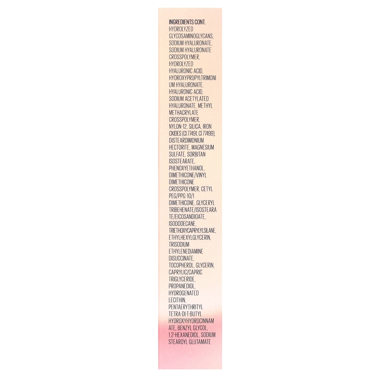Вода, циклопентасилоксан, диоксид титана (CI 77891), диметикон, оксиды железа (CI 77492), бутиленгликоль, цетилэтилгексаноат, дикаприлил карбонат, ПЭГ-10 диметикон, триметилсилоксисиликат, каприлил метикон, пентилен гликоль, пантенол, керамид NP, гидролизованные гликозаминогликаны, гиалуронат натрия, гиалуронат натрия кроссполимер, гидролизованная гиалуроновая кислота, гиалуронат гидроксипропилтримония, гиалуроновая кислота, ацетилированный гиалуронат натрия, метил метакрилат кроссполимер, нейлон-12, диоксид кремния, оксиды железа (CI 77491, CI 77499), дистеардимония гекторит, сульфат магния, сорбитан изостеарат, феноксиэтанол, диметикон/винил диметикон кроссполимер, цетил ПЭГ/ППГ-10/1 диметикон, глицерил трибегенат/изостеарат/эйкозандиоат, изододекан, триэтоксикаприлилсилан, этилгексилглицерин, тринатрий этилендиамин дисукцинат, токоферол, глицерин, каприловый/каприновый триглицерид, пропандиол, гидрогенизированный лецитин, пентаэритритил тетра-ди-трет-бутил гидроксигидроциннамат, бензилгликоль, 1,2-гександиол, натрия стеароил глутамат.