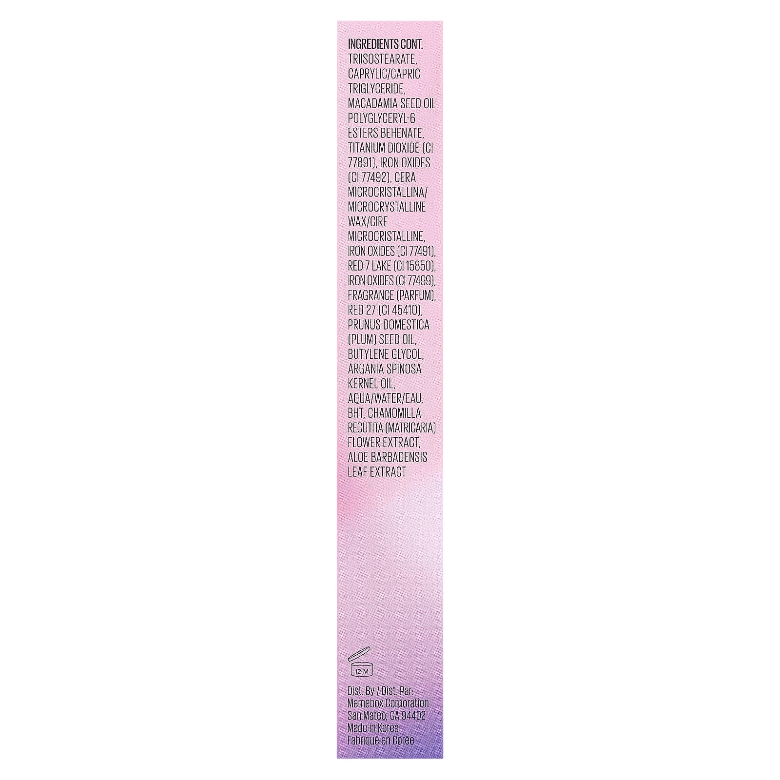 Гидрогенизированный полиизобутен, пентаэритритил тетраизостеарат, дифенил силокси фенилтриметикон, дипентаэритритил гексагидроксистеорат/гексастерат/гексаросинат, триметилсилоксифенил диметикон фитостерил/изостеарил/цетил/стеарил/бегенил димер дилинолеат, полиэтилен, полиглицерил-2, триизостеарат, каприловый/каприновый триглицерид, масло семян макадамии, полиглицерил-6 эфиры бегенат, диоксид титана (CI 77891), оксиды железа (CI 77492), микрокристаллический воск (Cera микрокристаллический)/микрокристаллический воск/микрокристаллический воск, оксиды железа (CI 77491), краситель красный 7 лак (CI 15850), оксиды железа (CI 77499), отдушка, краситель красный 27 (CI 45410). масло из косточек сливы (Prunus domestica), бутиленгликоль, аргановое масло (Argania spinosa), вода, бутилгидрокситолуол, экстракт цветков ромашки лекарственной (Chamomilla recutita), экстракт листьев алоэ вера (Aloe barbadensis).