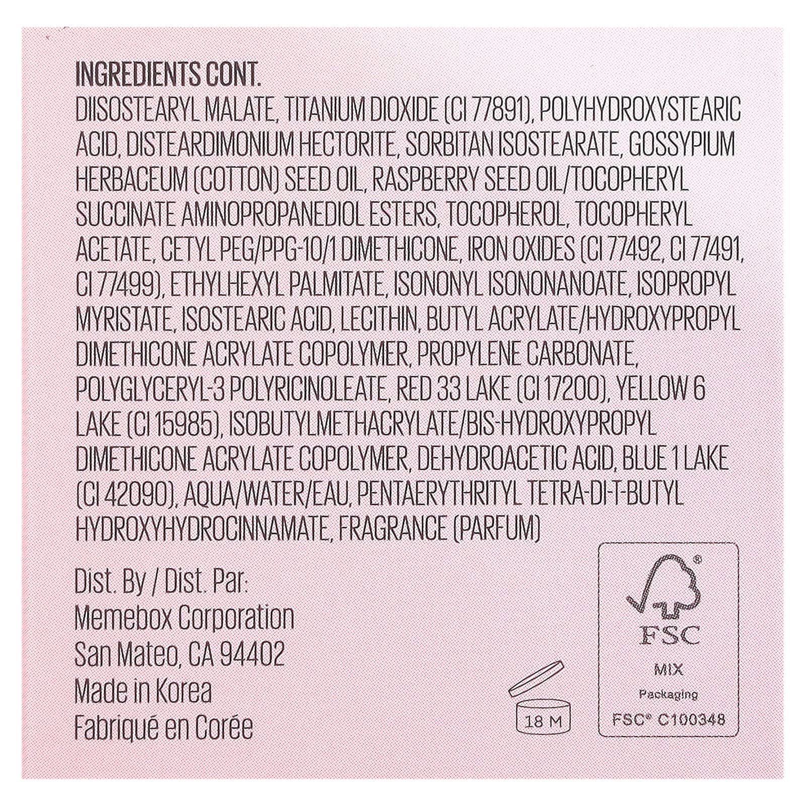 диметикон, диметикон/винил диметикон кроссполимер, изододекан, диметикон кроссполимер, полиглицерил-2 триизостеарат, диизостеарил малат, диоксид титана (CI 77891), полигидроксистеариновая кислота, дистеардимония гекторит, сорбитан изостеарат, семена хлопка (gossypium herbaceum), масло, масло семян малины, токоферил сукцинат аминопропандиоловые эфиры, токоферол, токоферилацетат, цетил ПЭГ/ППГ-10/1 диметикон, оксиды железа (CI 77492, CI 77491, CI 77499), этилгексил пальмитат, изононил изононаноат, изопропил диметикон акрилат сополимер, пропиленкарбонат, полиглицерил-3-полирицинолеат, краситель красный 33 лак (CI 17200), краситель желтый 6 лак (CI 15985), изобутилметакрилат/бис-гидроксипропил диметикон акрилат сополимер, дегидроуксусная кислота, краситель синий 1 лак (CI 42090), вода, пентаэритритил тетра-ди-трет-бутил гидроксигидроциннамат, отдушка.