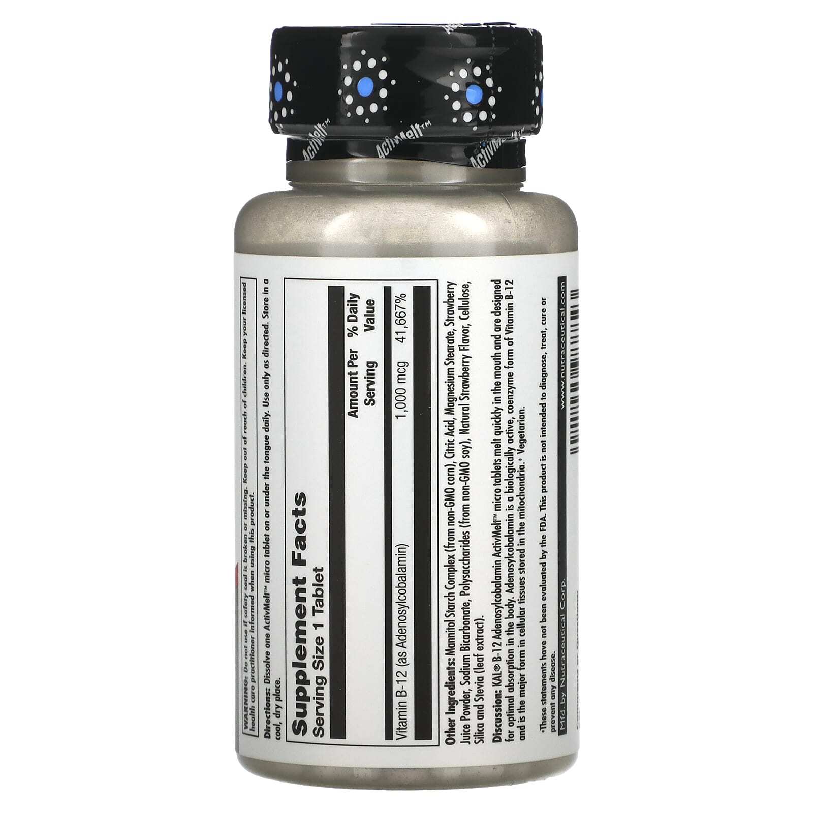 Обсуждение: Микротаблетки KAL B-12 Аденозилкобаламин ActivMelt, наполненные натуральным клубничным вкусом, быстро тают во рту и предназначены для улучшенного усвоения организмом. Аденозилкобаламин - биологически активная форма витамина B-12, он является основной формой в митохондриальных клеточных тканях. Вегетарианский продукт.