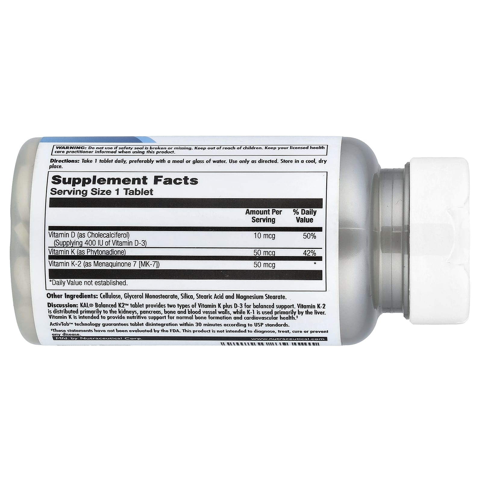 Описание. KAL® Balanced K2™ содержит два типа витамина K и D3 для сбалансированной поддержки. Витамин K2 распределяется в первую очередь в почках, поджелудочной железе, костях и стенках кровеносных сосудов, а K1 используется в основном в печени. Витамин K предназначен для обеспечения питательной поддержки нормального формирования костей и здоровья сердечно-сосудистой системы.