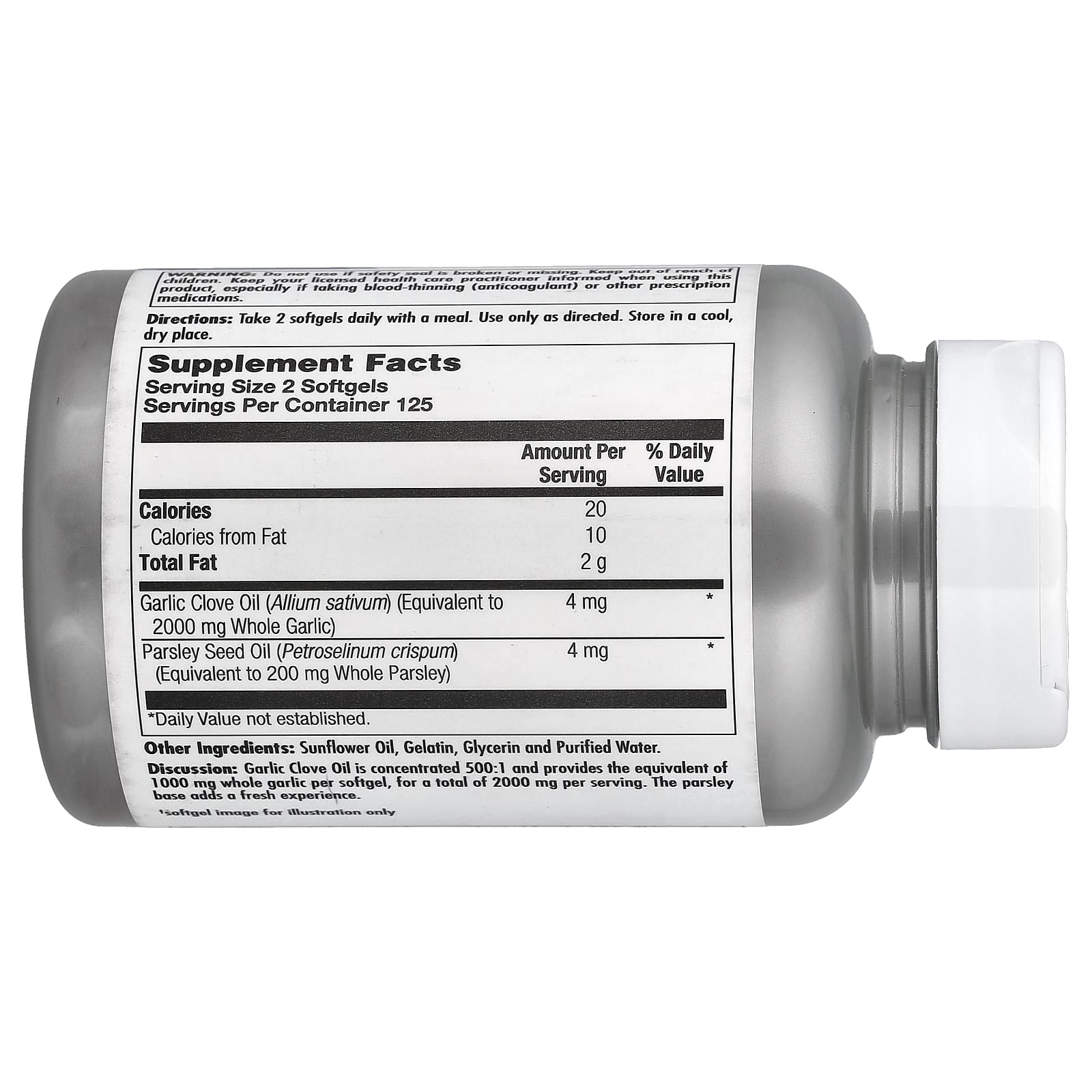 Описание. Масло с зубчиками чеснока концентрировано в соотношении 500:1 и содержит эквивалент 1000 мг цельного чеснока в 1 капсуле, что составляет в общей сложности 2000 мг в 1 порции. Основа из петрушки добавляет свежести.