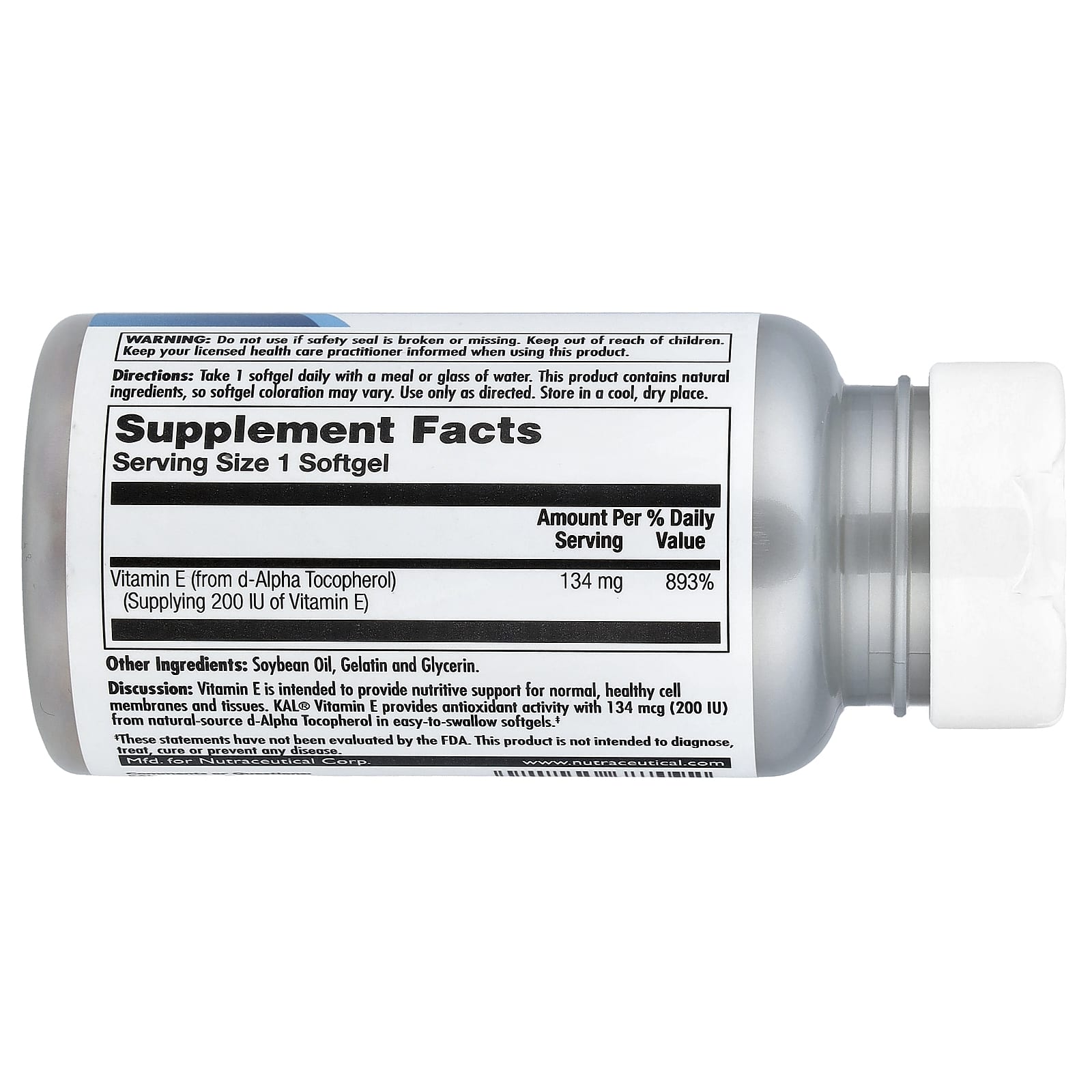 Описание. Витамин E предназначен для обеспечения питательной поддержки нормальных, здоровых клеточных мембран и тканей. Витамин E KAL® обеспечивает антиоксидантную активность благодаря 134 мкг (200 МЕ) из натурального источника d-альфа токоферола в мягких таблетках, которые легко глотать.