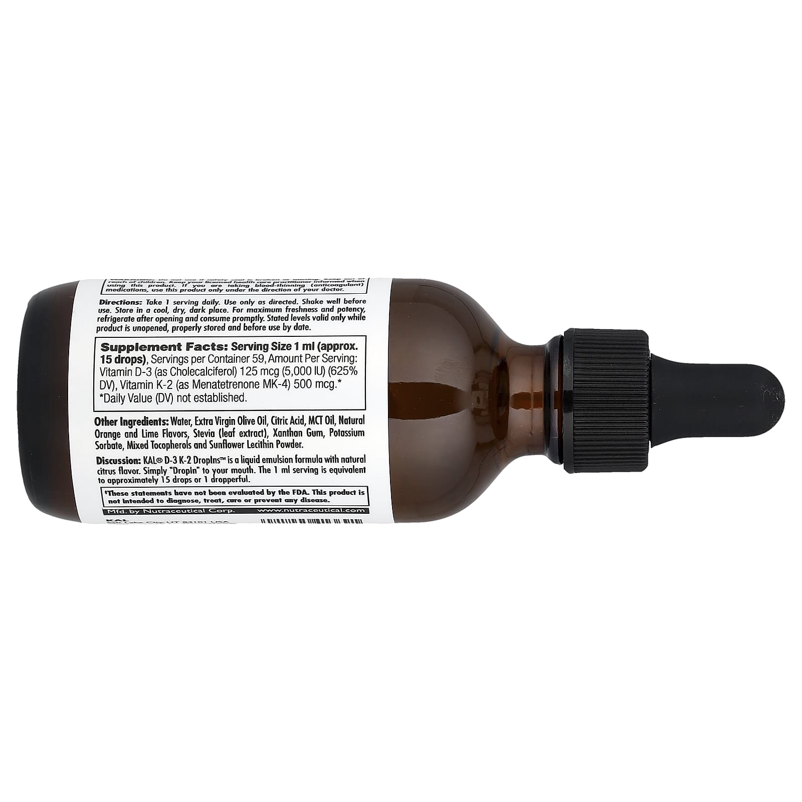 D-3 K-2 DropIns™ от KAL® — это жидкая эмульсия с натуральным цитрусовым вкусом. Просто закапайте в рот. Порция в 1 мл соответствует примерно 15 каплям или 1 пипетке.