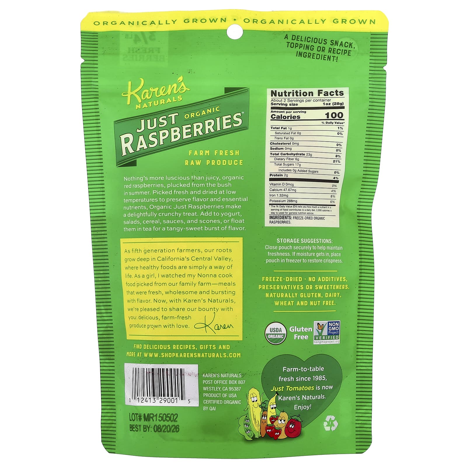 Мы — фермеры в пятом поколении, и наши корни уходят глубоко в Калифорнийскую долину, где здоровая пища является самым обычным делом. В детстве я наблюдала, как моя бабушка готовит продукты, собранные на нашей семейной ферме — свежие, полезные и насыщенные вкусом. Теперь, когда вы работаете с Karen's Natural's, мы рады поделиться с вами своим вознаграждением: вкусные свежие продукты, выращенные на ферме с любовью. — Karen