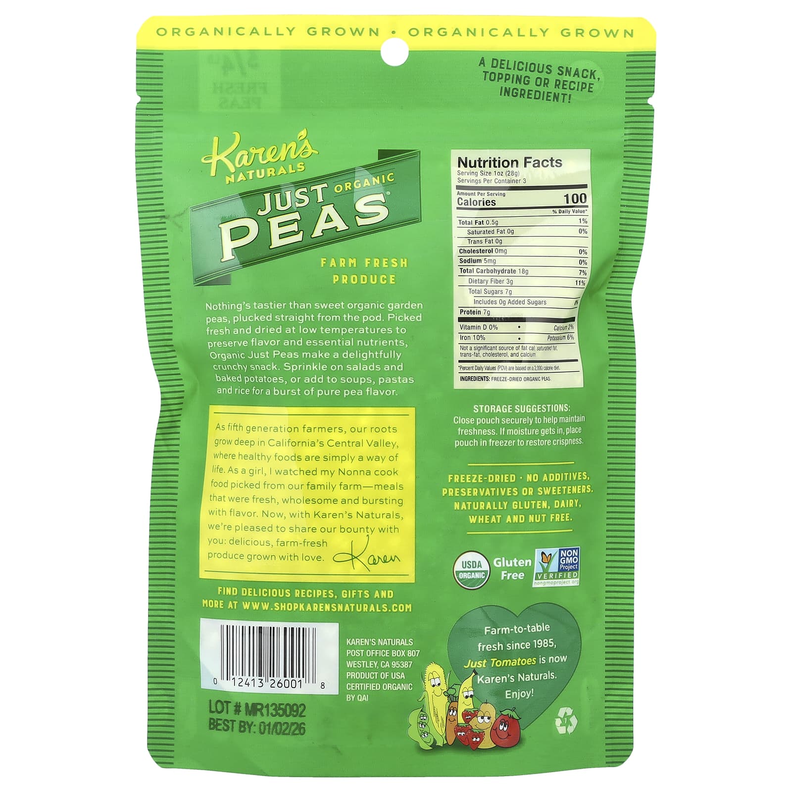 Мы — фермеры в пятом поколении, и наши корни уходят глубоко в Калифорнийскую долину, где здоровая пища является самым обычным делом. В детстве я наблюдала, как моя Нонна готовит еду, собранную на нашей семейной ферме, - блюда, которые были свежими, полезными и насыщенными. Теперь, вместе с Karen's Naturals, мы рады поделиться с вами нашей наградой: вкусные, свежие с фермы, выращенные с любовью. -Карен