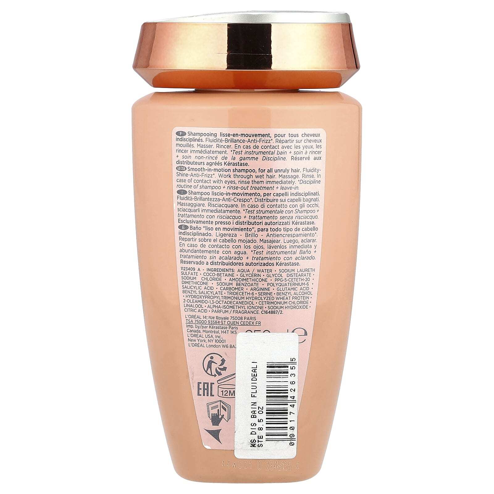 Вода, лауретсульфат натрия, коко-бетаин, глицерин, гликоль дистеарат натрия хлорид, амодиметикон, ППГ-5-цетет-20 диметикон, бензоат натрия, поликватерниум-6 салициловая кислота, карбомер, аргинин, бензил салицилат глутаминовой кислоты, тридецет-6, серин, бензиловый спирт, гидроксипропилтримоний, гидролизованный белок пшеницы, 2-олеамидо-1,3-октадекандиол, цетримония хлорид, линалоол, альфа-изометилионон, гидроксид натрия, лимонная кислота, парфюмерная композиция.
