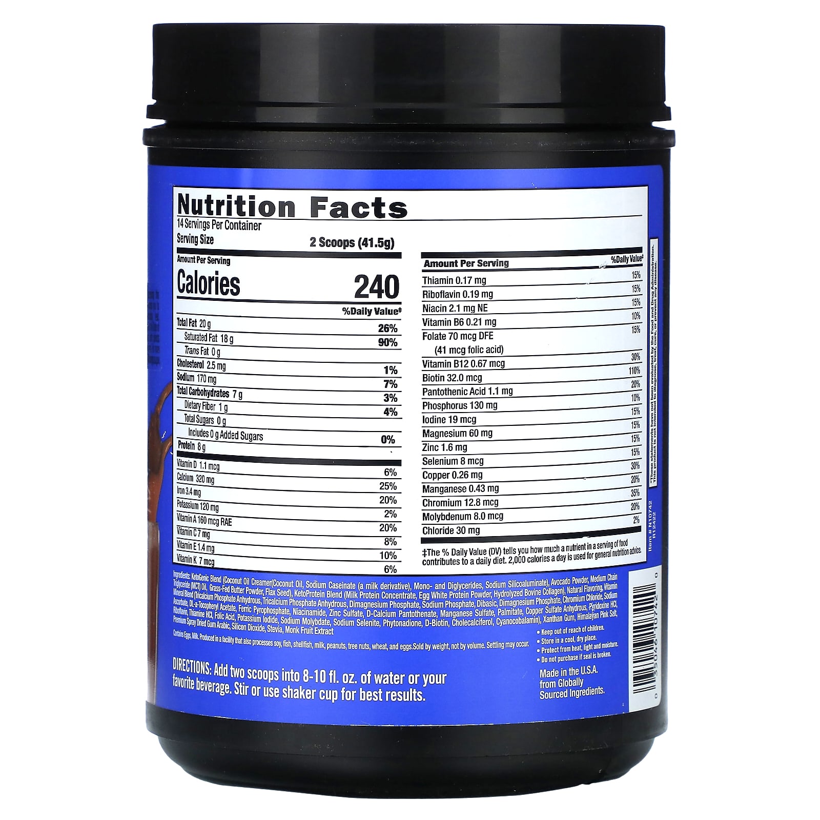 Кетогенная смесь (сливки с кокосовым маслом(кокосовое масло, казеинат натрия (производное от молока), моно- и диглицериды, силикоалюминат натрия), порошок из авокадо, масло со среднецепочечными триглицеридами (МСТ), порошок из масла от коров травяного откорма, семена льна), кетопротеиновая смесь (концентрат молочного протеина, протеиновый порошок из яичного белка, гидролизованный бычий коллаген), натуральный ароматизатор, смесь витаминов и минералов (трикальций фосфат безводный, трикальций фосфат безводный, димагний фосфат, фосфат натрия, двузамещенный, димагний фосфат, хлорид хрома, аскорбат натрия, dl-альфа-токоферил ацетат, пирофосфат железа, никотинамид, сульфат цинка, d-пантотенат кальция, сульфат марганца, пальмитат, сульфат меди безводный, пиридоксина гидрохлорид, рибофлавин, тиамина гидрохлорид, фолиевая кислота, йодид калия, молибдат натрия, селенит натрия, фитонадион, d-биотин, холекальциферол, цианокобаламин), ксантановая камедь, розовая гималайская соль, премиальная сушеная аравийская камедь, диоксид кремния, стевия, экстракт архата.
