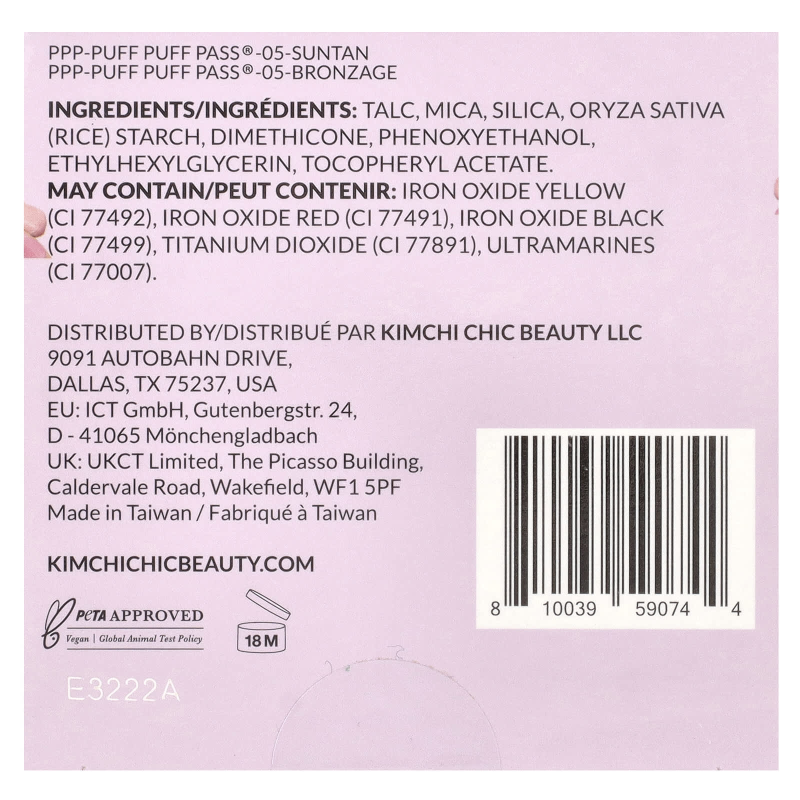 Тальк, слюда, диоксид кремния, рисовый крахмал, диметикон, феноксиэтанол, этилгексилглицерин, токоферилацетат.