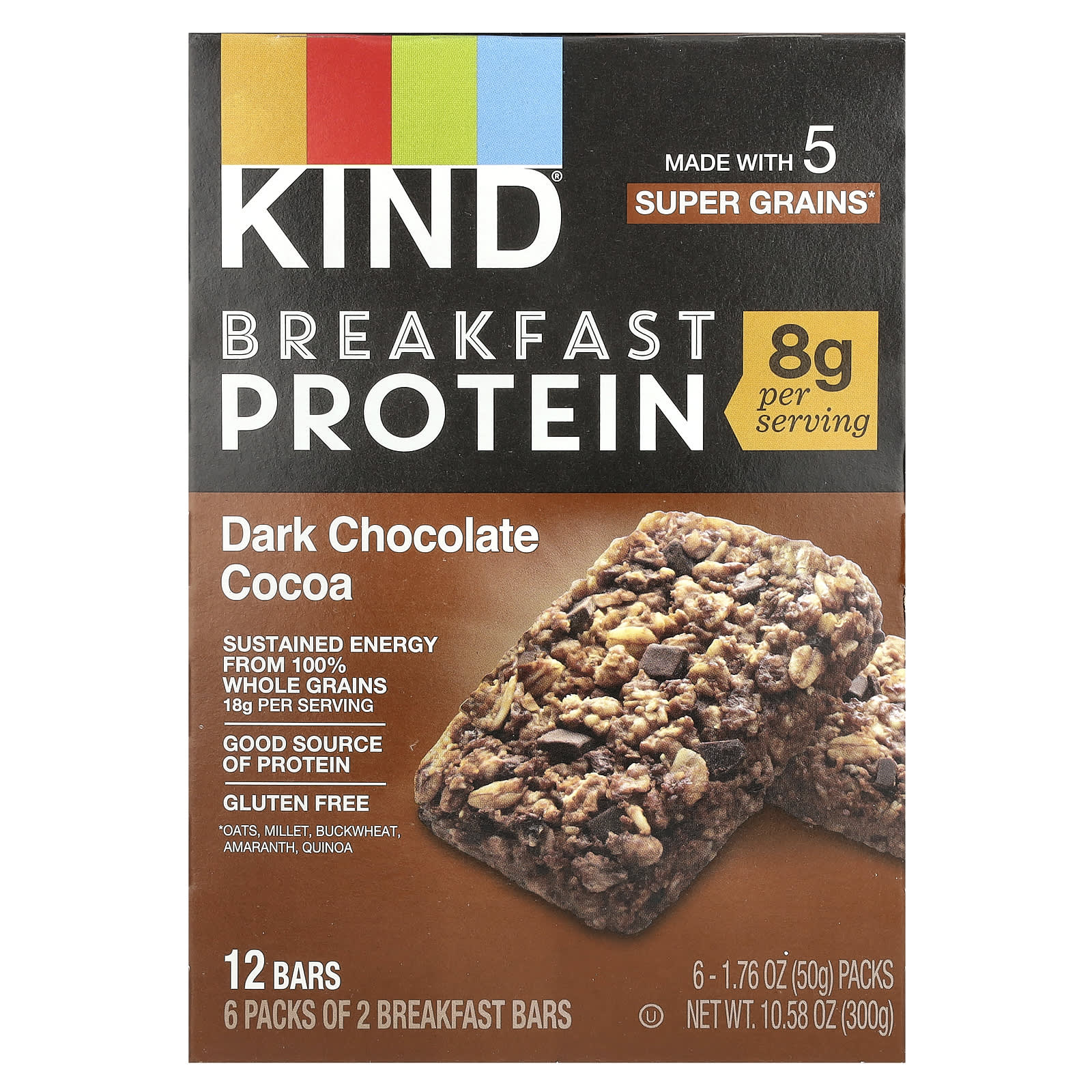 Протеиновые батончики с какао KIND Breakfast с темным шоколадом - это полезная и полезная закуска, состоящая из 100% цельных зерен для поддержания энергии. Протеиновые батончики для завтрака с какао KIND из темного шоколада изготовлены из пяти суперзернов: овса, гречихи, проса, амаранта и киноа. Они выпекаются со вкусом темного шоколада и какао. Они станут мягким и мягким дополнением к вашему завтраку. Батончики KIND поставляются в индивидуальной упаковке, по две упаковки, которые идеально подходят для удобных снеков без глютена на ходу. В каждой упаковке из двух батончиков содержится хотя бы одна полная порция цельнозерновых продуктов. Протеиновые батончики KIND Breakfast помогают обеспечить стабильную энергию, независимо от того, нужна ли вам питательная закуска для ланч-бокса или питательные батончики, которые можно взять с собой на выход. Эти батончики для завтрака без глютена, изготовленные из качественных и полезных ингредиентов, содержат 19 г цельного зерна на порцию и 0 г трансжиров. Эти полезные для здоровья снеки не содержат молочных продуктов и генетически модифицированных ингредиентов.
