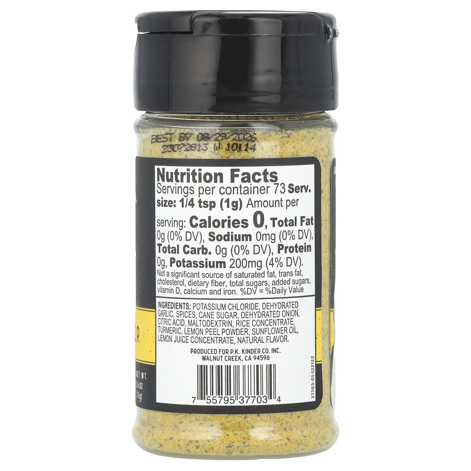Хлорид калия, обезвоженный чеснок, специи, тростниковый сахар, обезвоженный лук, лимонная кислота, мальтодекстрин, рисовый концентрат, куркума, порошок из цедры лимона, подсолнечное масло, концентрат лимонного сока, натуральный ароматизатор.